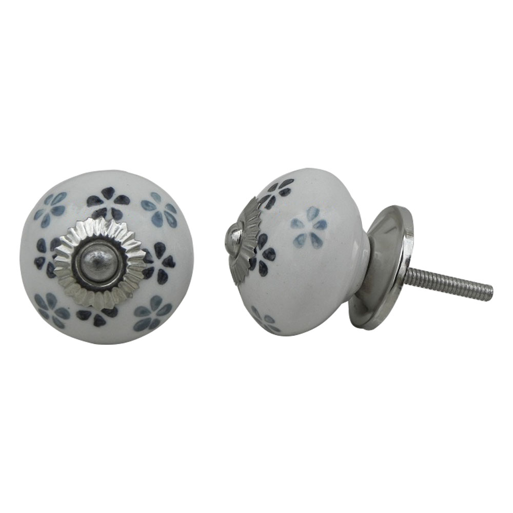 Det kræver ikke meget værktøj og er ikke noget stort projekt at skifte greb, men effekten er markant. Du kan endda kombinere nye greb med vores Kalkmaling, hvis du vil skabe en fuld makeover. Smukke porcelænsknopper, metalgreb, træhåndtag eller farverige keramikgreb – valget af greb bestemmer stemningen og gør det muligt at skabe præcis det udtryk, du drømmer om. Med dette smukke greb bliver selv det mest almindelige møbel til noget helt særligt. Porcelænsgrebet har en hvid farve og har grå og sort blomster mønster i glasuren.