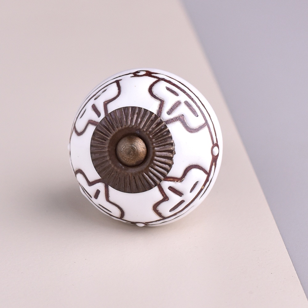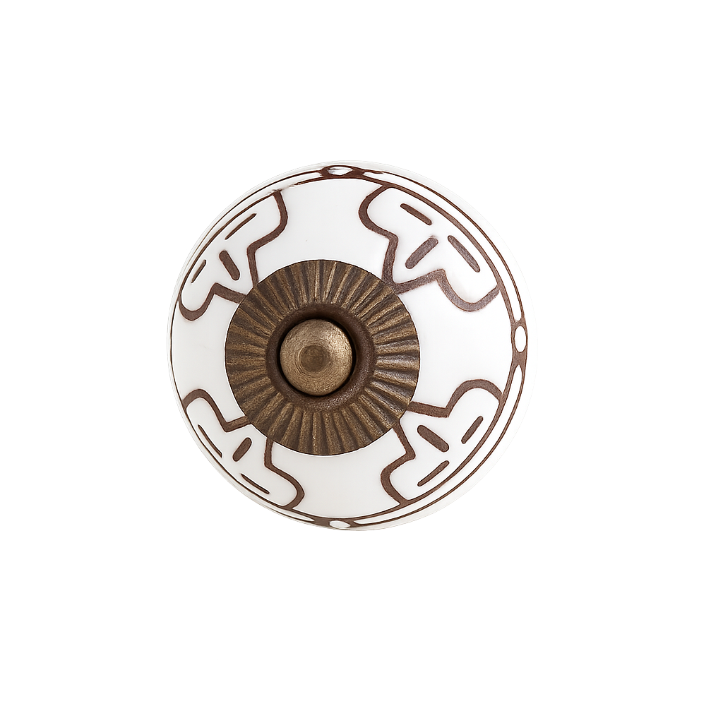 Se lige dette flotte greb. Perfekt til dine køkkenlåger og skuffer. Giv hele køkkenet et løft uden at udskifte elementerne. Med disse hvide greb med det smukke brune mønster, kan du med et enkelt skift forvandle et slidt eller anonymt møbel til noget, der føles moderne, personligt og helt dit eget. Uanset om du ønsker et romantisk, klassisk, minimalistisk eller farverigt look, findes der greb, der passer perfekt til din stil. Med de rette greb bliver selv det mest almindelige møbel til noget helt særligt. Smukke porcelænsgreb som er velegnet til køkkenlåger, som greb til skabe eller som greb til din kommode. Rosette og skive/skrue er udført i Antique messing.