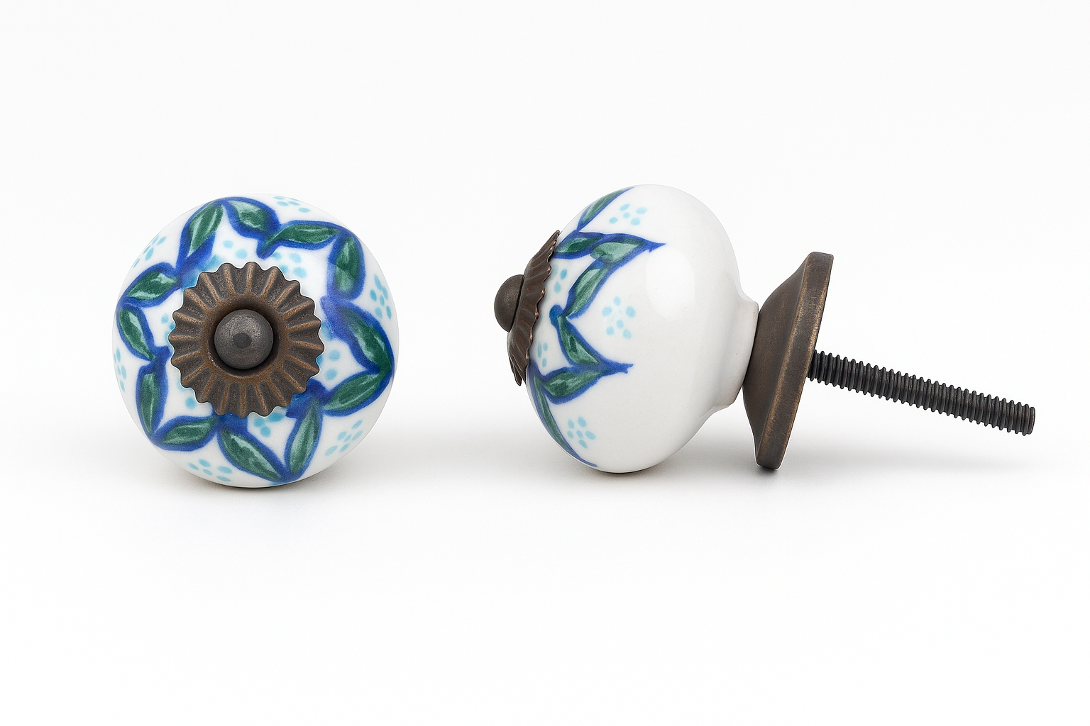 Det kræver ikke meget værktøj og er ikke noget stort projekt at skifte greb, men effekten er markant. Du kan endda kombinere nye greb med vores Kalkmaling, hvis du vil skabe en fuld makeover. Smukke porcelænsknopper, metalgreb, træhåndtag eller farverige keramikgreb – valget af greb bestemmer stemningen og gør det muligt at skabe præcis det udtryk, du drømmer om. Med dette smukke greb bliver selv det mest almindelige møbel til noget helt særligt. Porcelænsgrebet har en hvid farve og har sort og blå stjerme mønster i glasuren.
