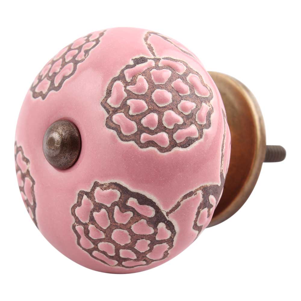 Smuk pink knop med mønster . Vores smukke blå knop til møbler eller skabslåger er prydet med hvide havplanter – en perfekt måde at forny dit hjem på. Du får et helt nyt og flot møbel som passer ind i din stil, eventuelt kan du også male møblet med Kalkmaling, for at fuldende dit projekt. Kedelige skabslåger og skuffer får nemt et nyt liv ved at skifte grebene, og du kan selv vælge hvilket udtryk dit møbel skal have. Denne smukke porcelænsknop er pink med brunt mønster.
