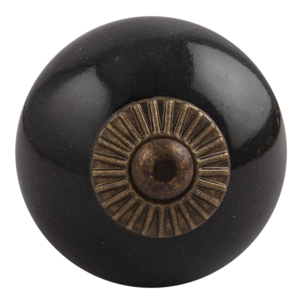 Skøn keramik greb i farven sort samt rosette i antique brass. Brug denne knop til udskiftning af greb i køkkenet eller badeværelset, og ved renovering af et gammelt skab, kommode eller lignende. Kraven i bunden kan vendes som det nu passer 'øjet' bedst. Se vores store udvalg af knopper her på webshoppen. Til gennemgående hul, hvor du blot saver det overskydende gevind af.