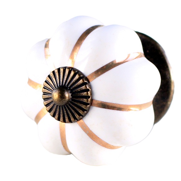 Dette porcelænsgreb kombinerer stil og funktionalitet, og giver et praktisk håndtag til dit møbel samtidig med at der tilføjes en luksuriøs touch til enhver indretning. Perfekt til skabe og skuffer hvilket gør det det nemt at forvandle dit hjem med simple midler. Du får et helt nyt og flot møbel som passer ind i din stil, eventuelt kan du også male møblet med Kalkmaling, for at fuldende dit projekt. Kedelige skabslåger og skuffer får nemt et nyt liv ved at skifte grebene, og du kan selv vælge hvilket udtryk dit møbel skal have. Denne smukke porcelænsknop er hvid med guldfarvede striber.