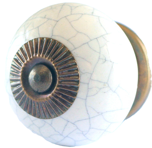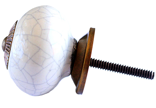 Krakkeleret rund porcelæns knop i en smuk creme hvid farve fra La Finesse. Denne smukke porcelæns knop er i creme hvid og med en krave og roset i antique messing som giver et fint patineret og nostalgisk look. Knoppen har en super fin krakkelering, der får den til at se gammelt og slidt ud. En klassisk og nostalgisk knop til dit fine gamle møbel. Har du en lille bitte kommode, passer disse knopper fra La Finesse helt perfekt og så er de lette at monterer, når blot der er hul igennem skuffen - sav det overskydende af og glæd dig hver dag over dit unikke møbel. Brug også de fine knopper fra La Finesse som en sød knage, hvor de er sat på et stykke nyt eller gammelt bræt og du har dit helt eget design af en sjov knagerække. Til gennemgående hul, hvor du blot saver det overskydende af.