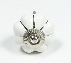 La Finesse keramik knop i hvid med sølv mønster og smuk roset i midten. Keramik knoppen er formet som en blomst og vil friske op på et hvilket som helst møbel. De smukke hvide knopper med det enkelte sølv mønster er så smuk og slet ikke til at modstå. Utrolig flotte på en kommode, dine skabe i soveværelset, dine låger i køkkenet eller badeværelset i dit sommerhuset, ja du kan nemt sætte dit eget præg på din indretning, uden de store forandringer. Du kan også monterer flere knopper på et flot stykke planke og du har en unik knagerække. Knoppen er meget let at monterer, man borere et hul, skruer knoppen i med møtrik på bagsiden og saver det overskydende af med en nedstryger.