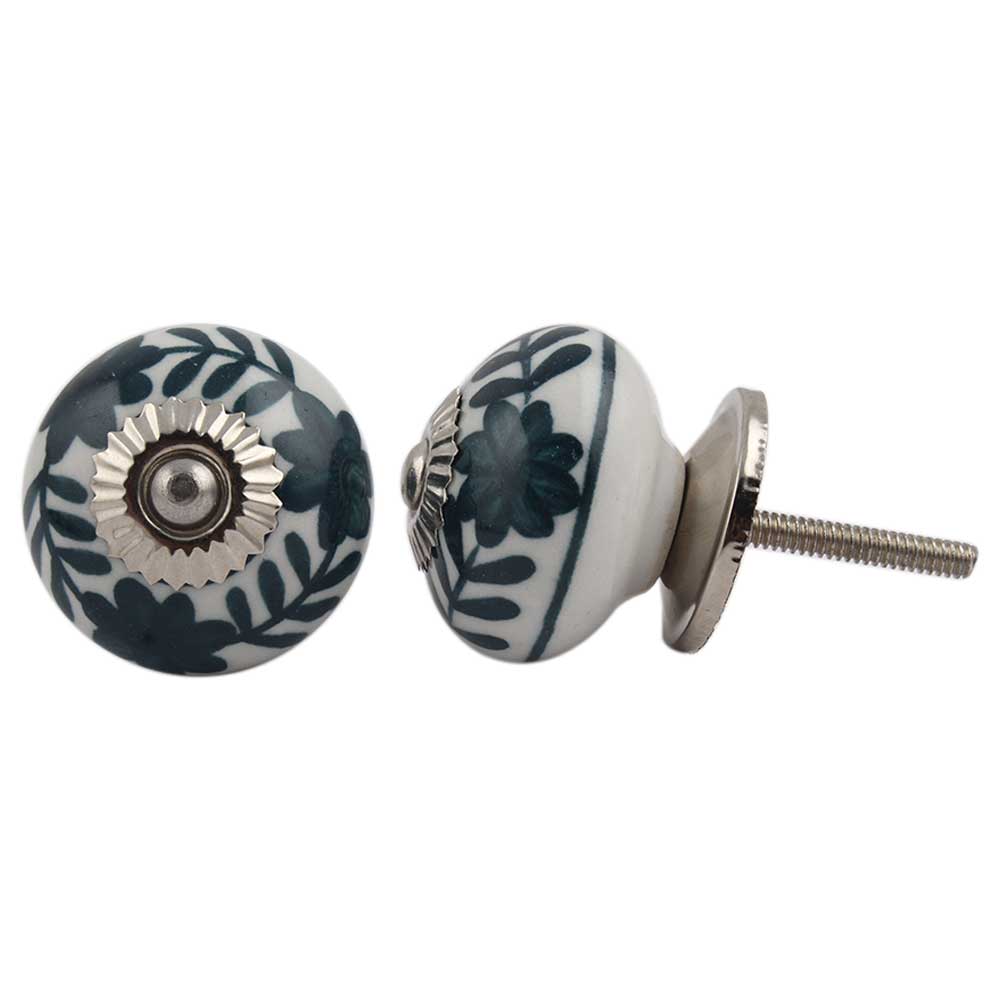 Et rigtigt fint greb i porcelæn med et smuk mørke grønt mønster. Det gør underværker at skifte greb ud på et kedeligt møbel, som mangler at blive "frisket op". Du får et helt nyt og flot møbel som passer ind i din stil, eventuelt kan du også male møblet med Kalkmaling, for at fuldende dit projekt. Kedelige skabslåger og skuffer får nemt et nyt liv ved at skifte grebene, og du kan selv vælge hvilket udtryk dit møbel skal have. Denne smukke porcelænsknop er hvid med mørke grøn blad mønster, samt sølv roset.