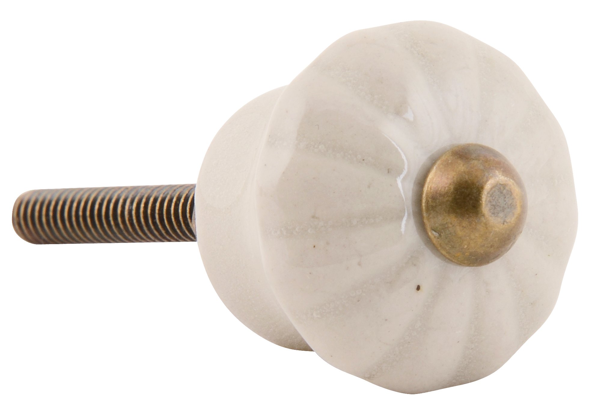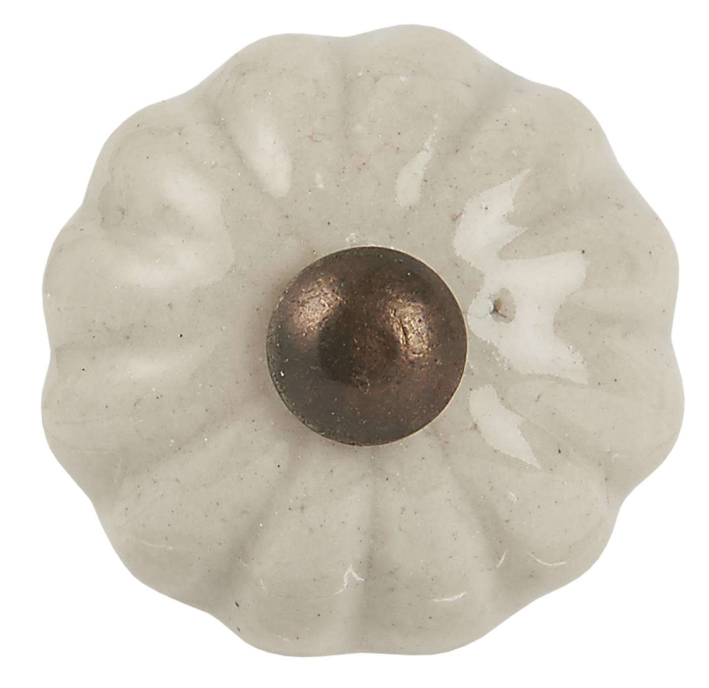 Greb fra Ib Laursen, som ligner en fin blomst og har gennemgående skrue af messing. Creme farvet keramik knop fra Ib Laursen, er fin som greb på en gammel chatol eller måske dine skabslåger på et lille skab, som du lige har renoveret. Grebet har en messingskrue som passer godt til den sarte creme farve. Knoppen - eller grebet passer til mange forskellige slags småmøbler og er nem at skifte ud på låger og skuffer.