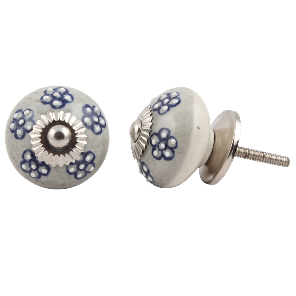 Det kræver ikke meget værktøj og er ikke noget stort projekt at skifte greb, men effekten er markant. Du kan endda kombinere nye greb med vores Kalkmaling, hvis du vil skabe en fuld makeover. Smukke porcelænsknopper, metalgreb, træhåndtag eller farverige keramikgreb – valget af greb bestemmer stemningen og gør det muligt at skabe præcis det udtryk, du drømmer om. Med dette smukke greb bliver selv det mest almindelige møbel til noget helt særligt. Porcelænsgrebet er grå og cremfarvet og har blå blomster i glasuren.