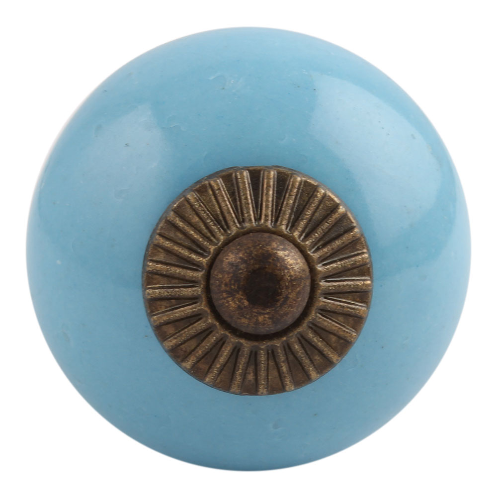 Skøn keramik greb i en flot blå farve, samt rosette i antique brass. Brug denne knop til udskiftning af greb i køkkenet eller badeværelset, og ved renovering af et gammelt skab, kommode eller lignende. Kraven i bunden kan vendes som det nu passer 'øjet' bedst. Se vores store udvalg af knopper her på webshoppen. Til gennemgående hul, hvor du blot saver det overskydende gevind af.
