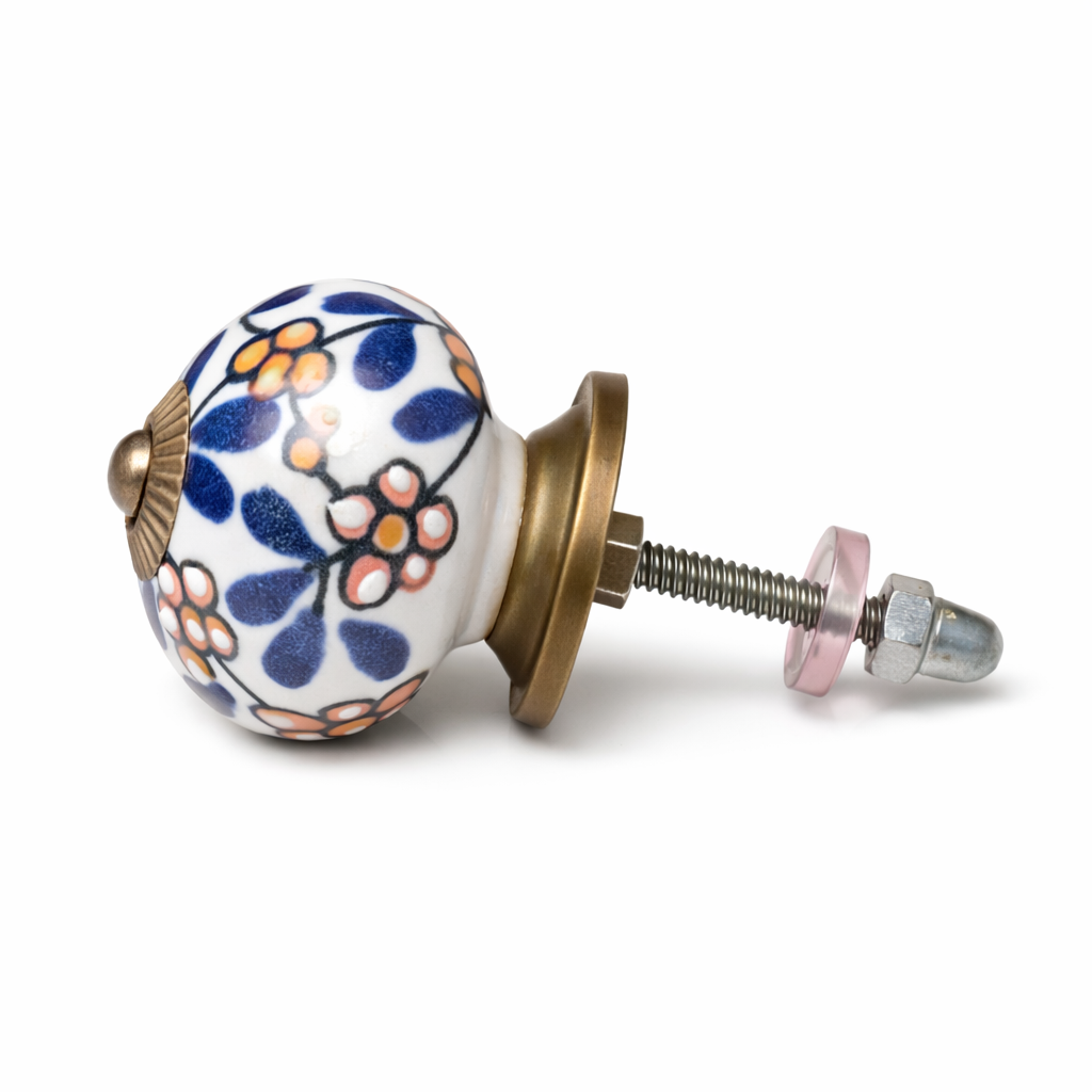 Denne knop i porcelæn er så smuk med de blå og brændt gule farver, samt rosetten udført  i et mørkt antikt udtryk. Det gør underværker at skifte greb ud på et kedeligt møbel, som mangler at blive "frisket op". Du får et helt nyt og flot møbel som passer ind i din stil, eventuelt kan du også male møblet med Kalkmaling, for at fuldende dit projekt. Kedelige skabslåger og skuffer får nemt et nyt liv ved at skifte grebene, og du kan selv vælge hvilket udtryk dit møbel skal have. Denne smukke porcelænsknop ville være super smuk, på alt lige fra hvide skabslåger til kommoder i mørkt træ eller måske et blåt vitrineskab.