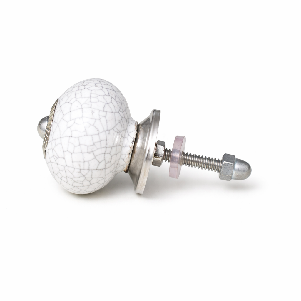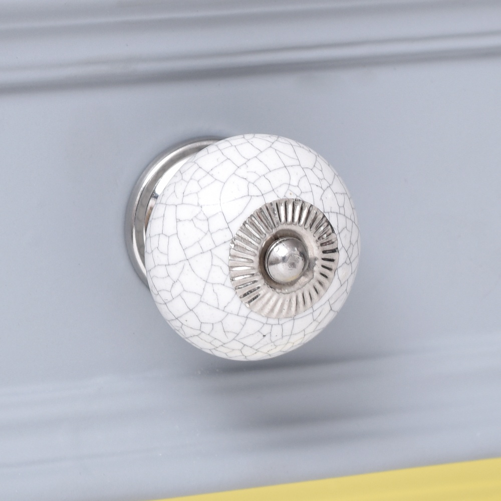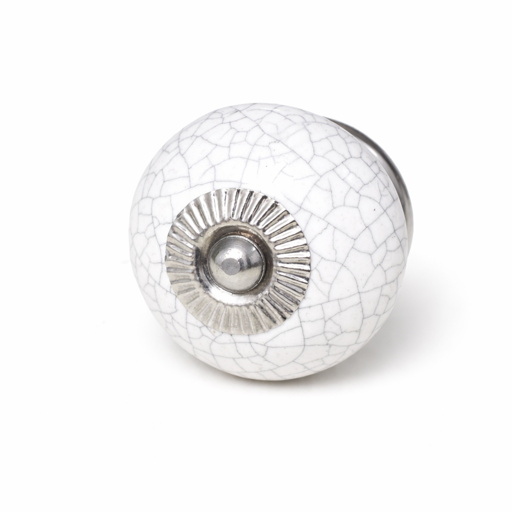 Denne fine porcelænsknop med krakeleret overflade er dekorativ og giver et charmerende og unikt udtryk. At udskifte grebene på et møbel er en enkel måde at forvandle et kedeligt skab eller en skuffe til et personligt og stilfuldt element i indretningen. Med nye greb får dit møbel straks et frisk og opdateret look, der passer til netop din stil. Ønsker du at fuldende forvandlingen, kan møblet med fordel males med kalkmaling for et harmonisk og gennemført resultat. Knoppen er udført i hvidt porcelæn med dekorative krakeleringer og en elegant sølvfarvet roset, som tilsammen skaber et klassisk og tidløst udtryk.