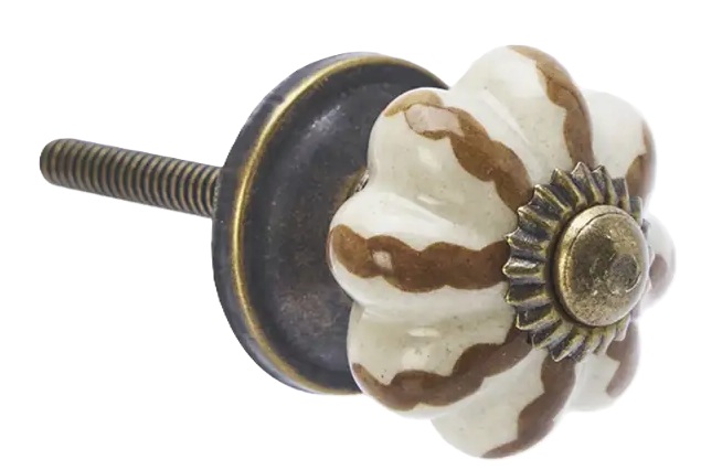 Et rigtigt fint håndmalet greb i porcelæn fra Madam Stoltz. Det gør underværker at skifte greb ud på et kedeligt møbel, som mangler at blive "frisket op". Du får et helt nyt og flot møbel som passer ind i din stil, eventuelt kan du også male møblet med Kalkmaling fra Vintage Paint eller kalkmaling.dk, for at fuldende dit projekt. Kedelige skabslåger og skuffer får nemt et nyt liv ved at skifte grebene, og du kan selv vælge hvilket udtryk dit møbel skal have. Grebet er her i en hvid farve med et karakterfuldt brunt mønster, og fuldendes smukt af en antik messing skrue, der tilfører et strejf af vintage charme.