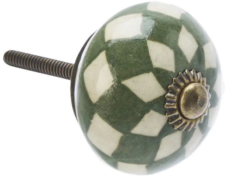 Et rigtigt fint håndmalet greb i porcelæn fra Madam Stoltz. Det gør underværker at skifte greb ud på et kedeligt møbel, som mangler at blive "frisket op". Du får et helt nyt og flot møbel som passer ind i din stil, eventuelt kan du også male møblet med Kalkmaling fra Vintage Paint eller kalkmaling.dk, for at fuldende dit projekt. Kedelige skabslåger og skuffer får nemt et nyt liv ved at skifte grebene, og du kan selv vælge hvilket udtryk dit møbel skal have. Grebet er her i en grøn farve med et karakterfuldt hvidt mønster, og fuldendes smukt af en antik messing skrue, der tilfører et strejf af vintage charme.