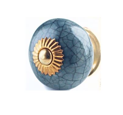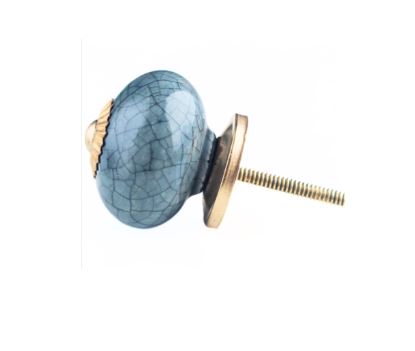 Et rigtigt fint greb i porcelæn med en smuk krakelering. Det gør underværker at skifte greb ud på et kedeligt møbel, som mangler at blive "frisket op". Du får et helt nyt og flot møbel som passer ind i din stil, eventuelt kan du også male møblet med Kalkmaling, for at fuldende dit projekt. Kedelige skabslåger og skuffer får nemt et nyt liv ved at skifte grebene, og du kan selv vælge hvilket udtryk dit møbel skal have. Denne smukke porcelænsknop er blågrå med krakeleret mønster og møtrik og rosetten har farven guld.