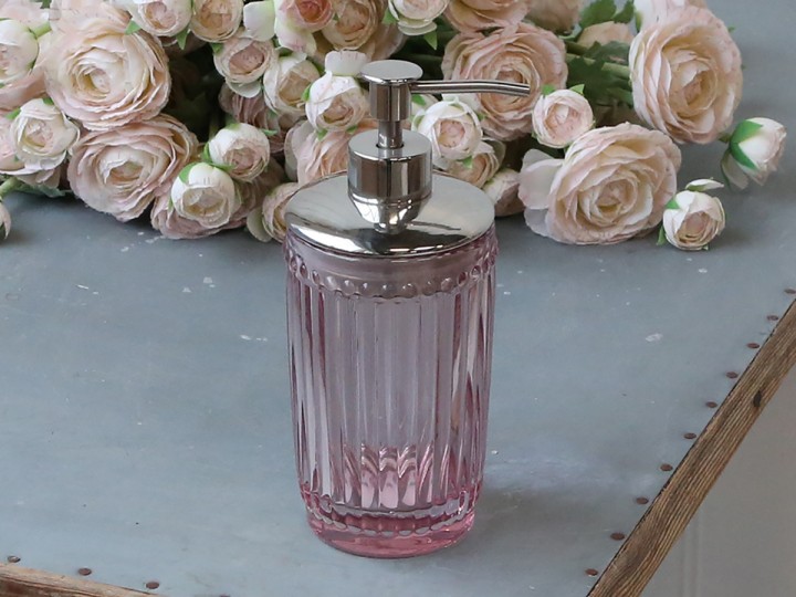 Rigtig flot sæbredispenser med perlekant i farven rosa.  Denne sæbedispenser er fra Chic Antique og super smuk med sit glas i den fine rosa farve med en sød perlekant i toppen, samt pumpe i rustfri stål.  Du kan bruge denne flaske til alt ligefra flydende håndsæbe, opvaskemiddel eller måske hånddesinfektion, så har du altid en pæn flaske stående, som både er praktisk og pynter. Brug den i badeværelset, hvor du eventuelt kan fylde den med håndsæbe eller hånddesinfektion. I køkkenet kan du bruge den til opvaskemiddel og hånddesinfektion, så har du ikke en kedelig plastikbeholder stående med dit opvaskemiddel i.