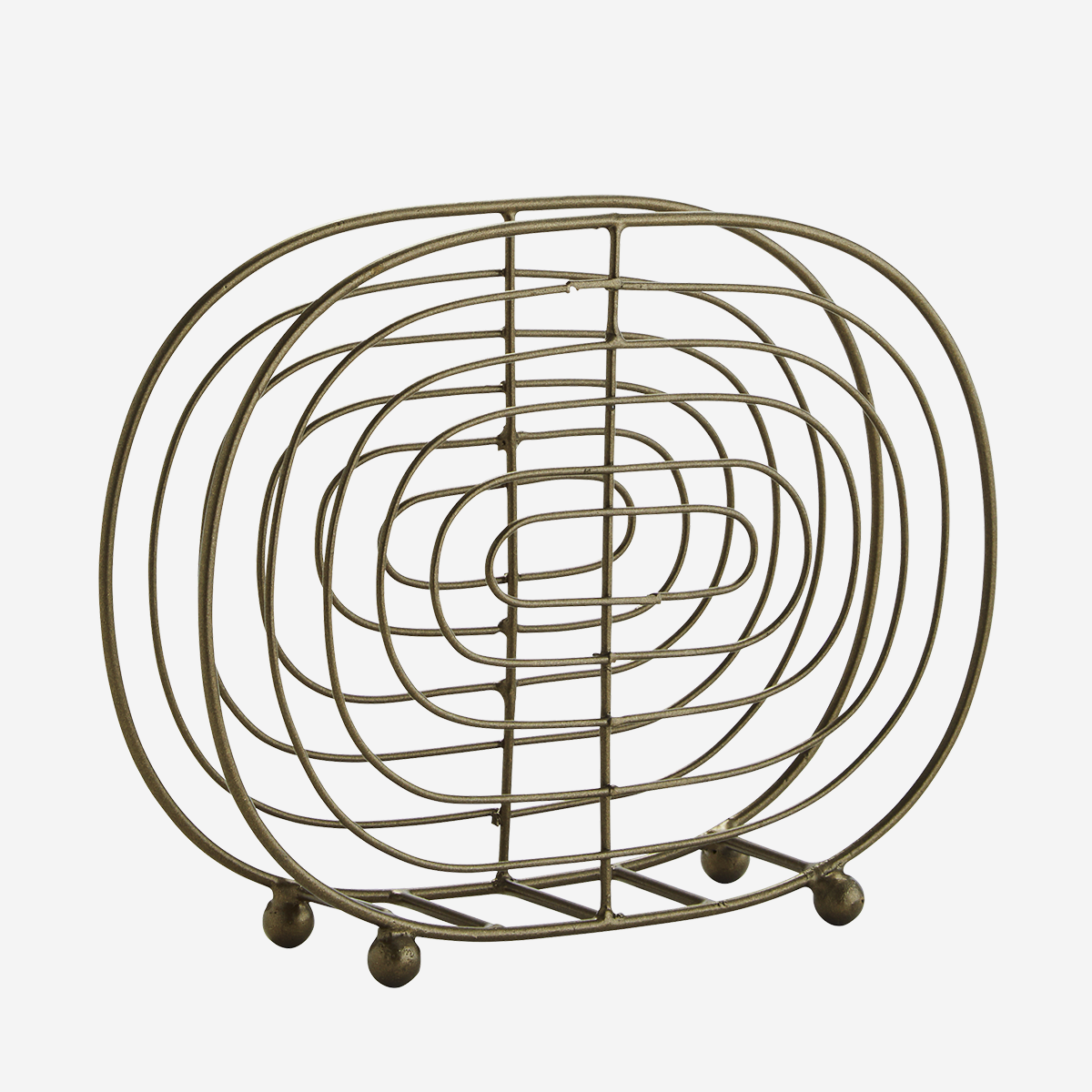 Madam Stoltz er mesteren bag denne smukke runde servietholder, fremstillet i jern med antique messing finisch. Et meget anvendeligt og yderst smukt stykke kunst i rette linier med brugspotientale. Stil den på middagsbordet med papirservietter eller nogle af stof. Vi har dem i to farver - her er det antique brass.