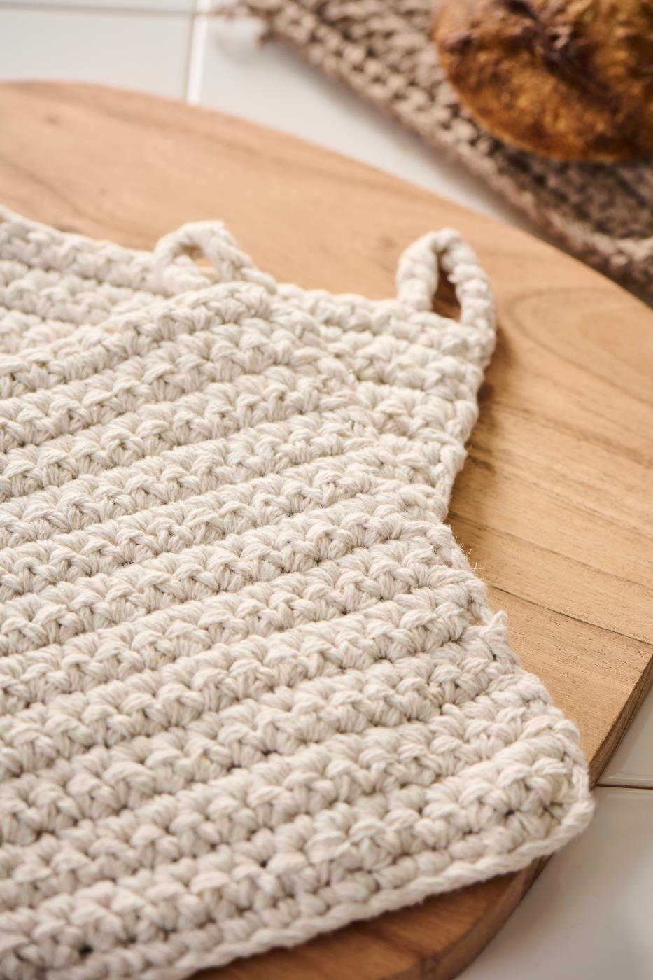 Super lækker grydelap fra Ib Laursen, med strop. Denne flotte grydelap er hæklet, og har et flot mønster med sit beige farvede garn. Grydelappen er lavet af 100% bomuld, og er rigtig god når du skal have noget varmt ud af ovnen. De smukke grydelapper passer fint ind i et smukt gammelt landkøkken, det moderne køkken, eller måske i det lille hyggelige køkken i sommerhuset, ja overalt hvor man lige har brug for nogle grydelapper som ikke ligner alle de andre.