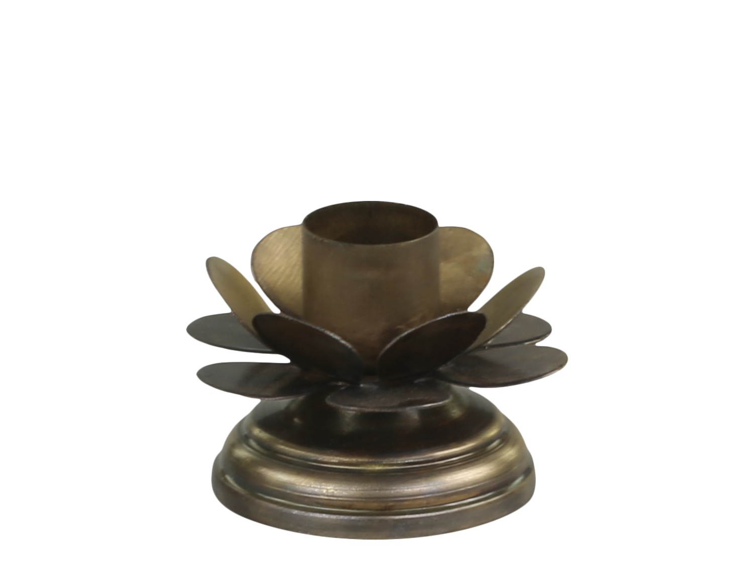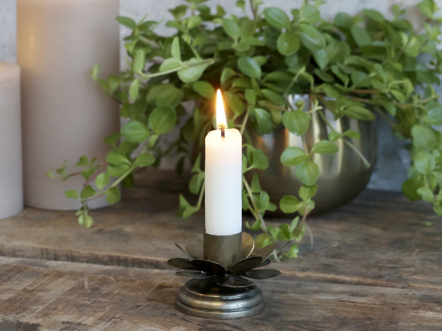 Enkelt og fint stage i metal, formet som en blomst fra Chiq Antique. Stagen er i messing, hvilket gør den utrolig smuk. Sæt dem i det lille vindue, eller i flok på et fad med et skøt mix af vaser, stager og måske et par smukke sten fra stranden, eller på et veldækket bord når familien kommer til middag. Du finder også Bedelys i mange farver her hos Butik-Lundager.