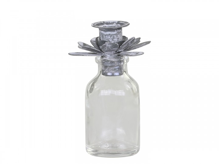 Den lille mini glasflaske fra Chic Antique, er super sød og deokrativ med sin flotte lysholder. Den fine glasflaske har en flot lysholder som er formet som en smuk blomst. Du kan også vælge at bruge flaske uden lysholderen og i stedet pynte den med en lille blomst fra haven. Det er så sødt at have en lille "oase" stående i et vindue eller på en bakke på stuebordet, hvor du kan pynte med forskellige lysestager, vaser og måske en grøn plante. Pynt dit køkkenvindue med disse fine flasker som findes i tre forskellige størrelser. Her ser du den mindste flaske som kan indeholder 20 ml. Se de øvrige størrelse på Glasflasker med lysholder her på siden.