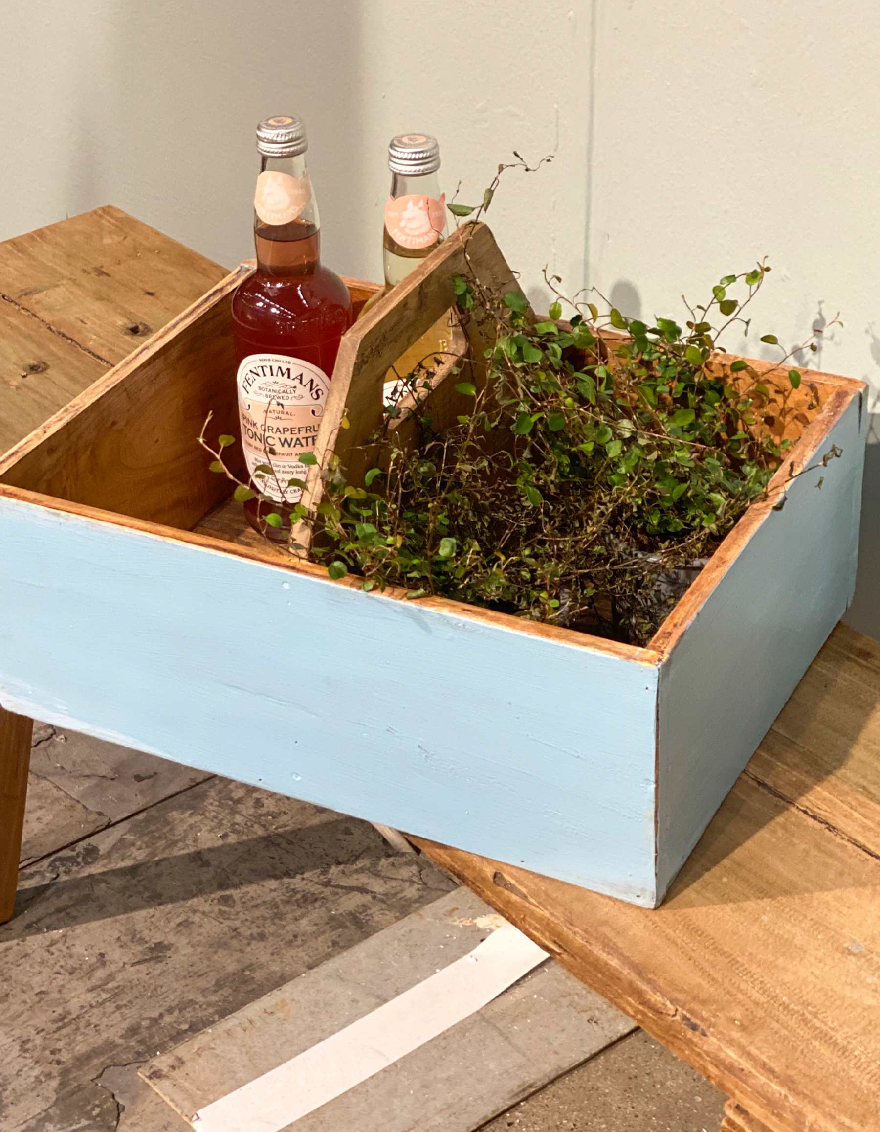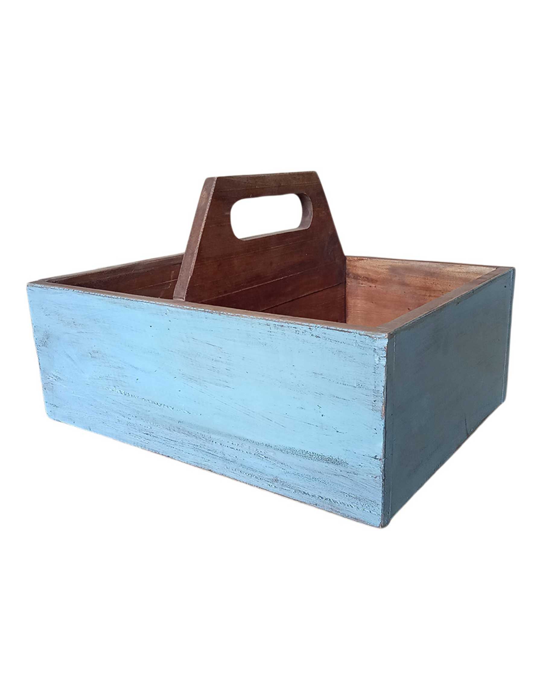 Flot kraftig trækasse i blå med træhåndtag lavet af genbrugstræ med 2 rum fra Sjælsø Nordic. Da træet er gammelt, har trækasserne en hel naturlig patina. Genbrugstræet kan være teak, akacie og mahogni eller andre hårdt træsorter. Træet stammer som regel fra gamle huse, lastbiler eller træstilladser, men har nu fået nyt liv i form af en flot træbakke. Sjælsø Nordic har fået trækassen håndmalet i en skøn lyseblå farve. Brug kasserne i haven til frugt eller til haveredskaber, eller på terrassen eller udekøkkenet med flasker og krydderier i. Kasserne er lavet i hånden og kun meget simple værktøjer er brugt. Der kan derfor godt være mindre forskelle fra et produkt til et andet. Det tilfører bare kasserne ekstra charme. Kasserne er nostalgiske og vil helt sikkert tilføre hygge og autenticitet til dit hjem, uanset hvordan du vælger at bruge dem.