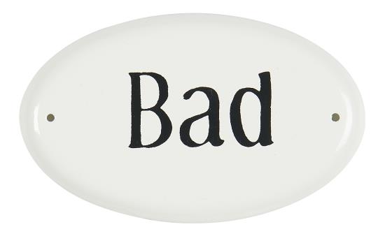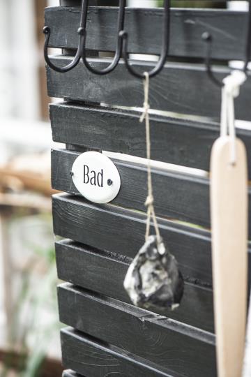 Lille sød metalskilt fra Ib Laursen. Skiltet er udført i metal og har påskriften, Bad. Hyggeligt skilt at have hængende på døren eller væggen ind til badeværelset, så kan dine gæster altid finde vej til dit badeværelse. Brug den også gerne ved dit sommerhus, og hæng den ved ude bruseren eller hanen hvor du vasker fødder efter du er kommet op fra stranden.