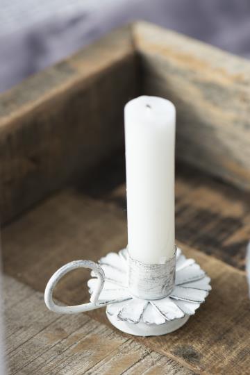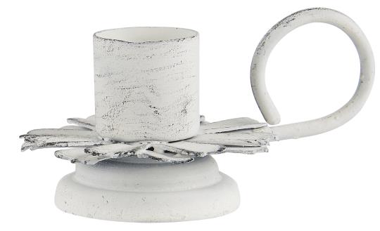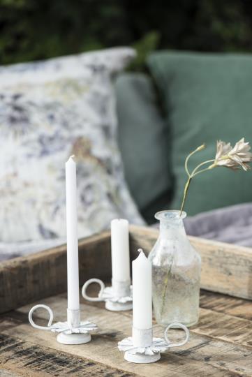 Enkelt og fint stage på fod lavet af metal og formet som en blomst, fra Ib Laursen. Stagen er udført i farven hvid og har patina med et grålig skær, hvilket gør den utrolig smuk. Stagen har en praktisk hank, så den er nem at flytte rund på. Sæt dem i det lille vindue, eller i flok på et fad med en skøn mix af vaser, stager og måske et par smukke sten fra stranden, eller på et veldækket bord når familien kommer til middag. Du finder også Bedelys i mange forskellige farver her hos Butik-Lundager.