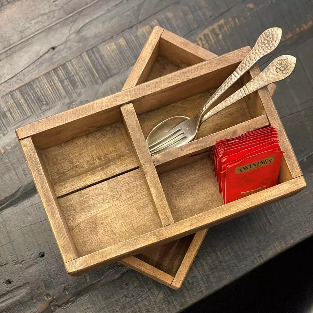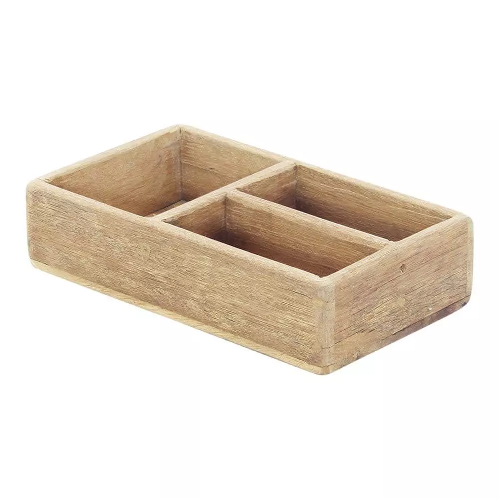 Denne flotte træbakke, lavet af genbrugstræ, er fra Sjælsø Nordic. Kassen har 3 små rum og er meget anvendelig i dit køkken eller på badeværelset. Genbrugstræet kan være akacie, teak eller mahogni. Træet stammer fra gamle huse, træstilladser eller lastbiler. Det smukke træ har nu fået nyt liv i form af denne træbakke.
