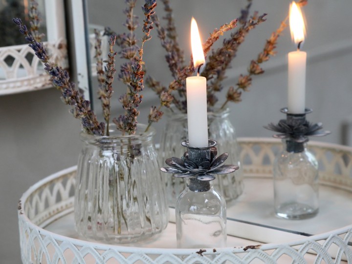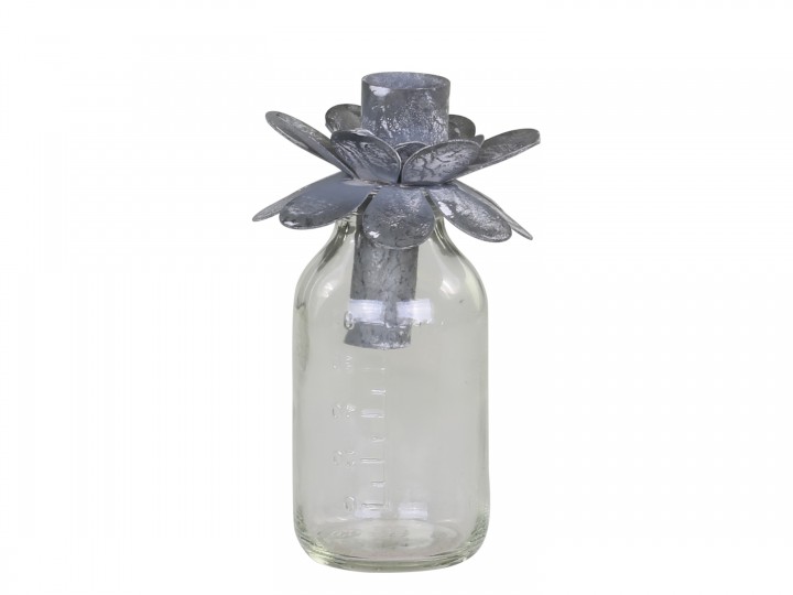 Den fine glasflaske fra Chic Antique, er super sød og deokrativ med sin flotte lysholder. Til glasflaske medfølger en flot lysholder som er formet som en smuk blomst. Du kan også vælge at bruge flaske uden lysholderen og i stedet pynte den med en lille blomst fra haven. Det er så sødt at have en lille "oase" stående i et vindue eller på en bakke på stuebordet, hvor du kan pynte med forskellige lysestager, vaser og måske en grøn plante. Pynt dit køkkenvindue med disse fine flasker som findes i tre forskellige størrelser. Her ser du flasken i mellem størrelse, som kan indeholder 100 ml. Se de øvrige størrelse på Glasflasker med lysholder her på siden.