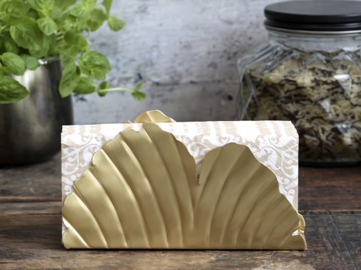 Super smuk og stilfuld servietholder fra Chic Antique. Servietholderen har en flot form. og ligner næsten et stort blad. Den er fremstillet i jern med har en smukt messing finish, som gør den meget stilfuld. Et meget anvendeligt og yderst smukt stykke kunst, som vil pynte på ethvert bord. Du kan brugen den til alle slags servietter lige fra papirservietter eller måske nogle stof servietter.