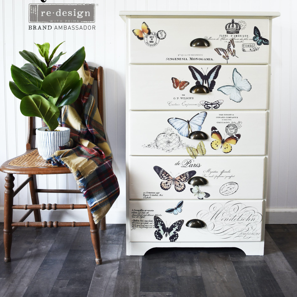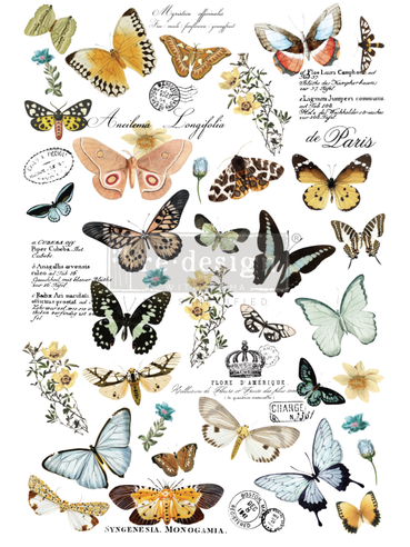 Som noget helt nyt har vi fra Vintage Paint de smukke transfers fra Redesign. Det er helt utrolig hvordan du nemt kan forvandle dine møbler til noget helt unik, som du ikke ser andre steder, og som vil vække opsigt hos dine gæster. Du kan dekorerer et hvilket som helst møbel, som du syntes skal friskes op, alt ligefra din gamle kommode, bordet, din taburet, en serveringsbakke, eller måske en kedelig skabslåg i soveværelse. Når du har malet dit møbel med kalkmaling, kan du bruge denne fine transfer med de smukke sommerfugle for at få et unikt møbel. Du kan klippe billederne ud, og placerer sommerfuglene som du ønsker at bruge på dit projekt, helt som du syntes det ser pænest ud. Placer nu din transfer midlertidig med malertage for at se din placering på dit projekt. Herefter kan du fjerne filmen og påfører transferen med en isskraber eller en anden genstand som kan overfører din transfer. Pakken indeholder 1 stort billede opdelt i 3 ark med nedenstående mål.