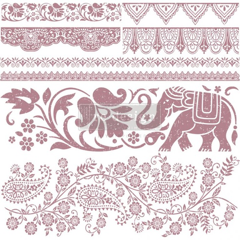 De er så smarte de nye stempler fra Redesign, hvor du kan se mønstret helt tydeligt igennem det klar stempel, inden du påfører maling. Du kan dermed ligge stemplet på dit projekt og se hvordan placeringen er helt perfekt, inden du laver de endelige tryk med maling. Disse stempler er fleksible og kan bøjes, du kan dermed lave et stempel om en rund genstand og få det til at flot ud. Stemplerne kan rengøres med vand og sæbe med en lille børste eller du kan tørre dem af med vådservietter, sørt for at de er helt rene, så kan de genbruges mange gange. Du kan bruge Kalkmaling fra Vintage Paint, så bliver det særlig flot, det er rigtig nem at male med. Huske at efterbehandle dit kalkmalede projekt med voks eller lak for at det er mere holdbar. Du kan dekorere på borde, kommoder og skabe, flasker, kasser ja alt hvad du har lyst til, det er kun fantasien som sætter grænsen. Et smukt stempel med flotte border og dekorative mønster, som kan bruges samlet eller hver for sig.
