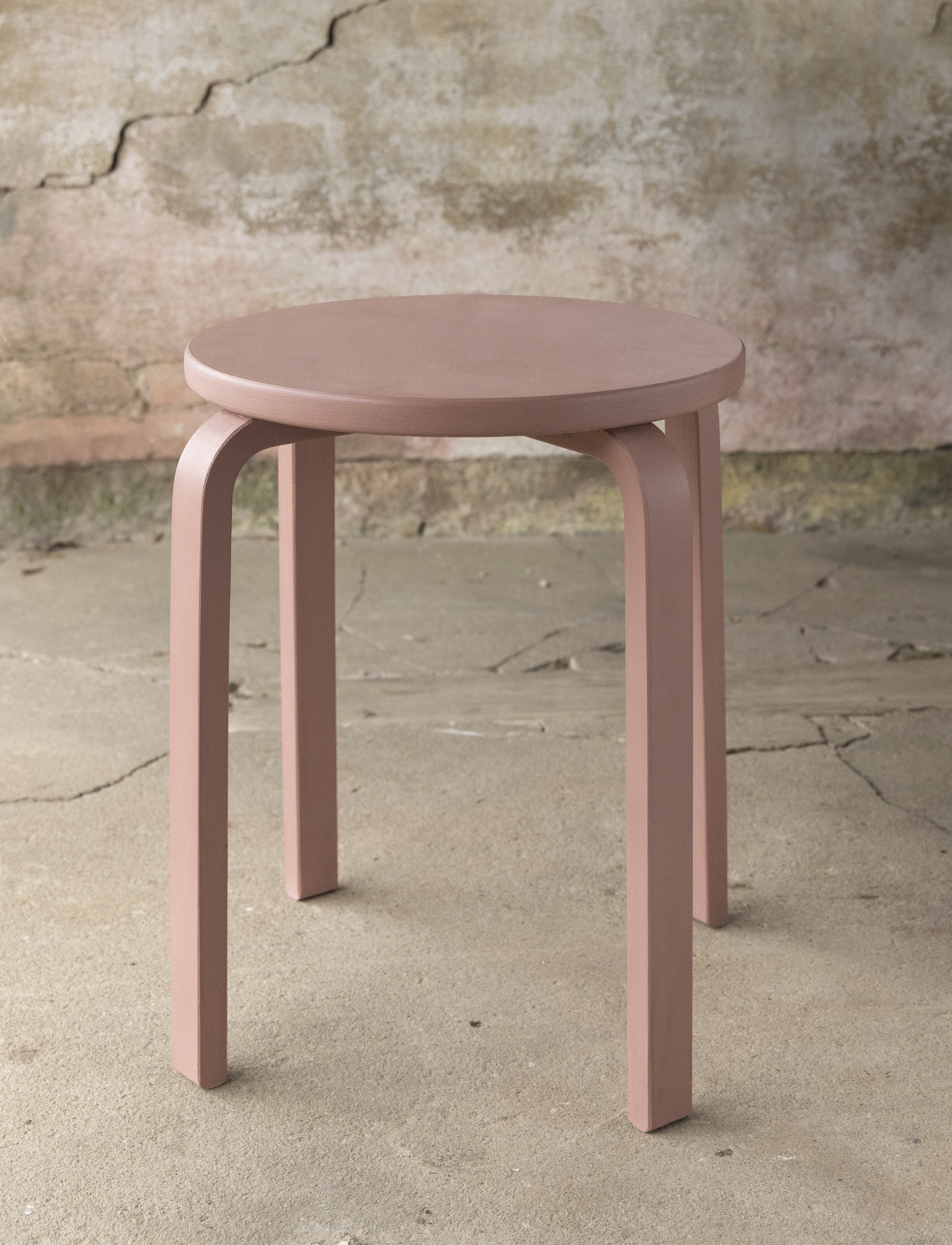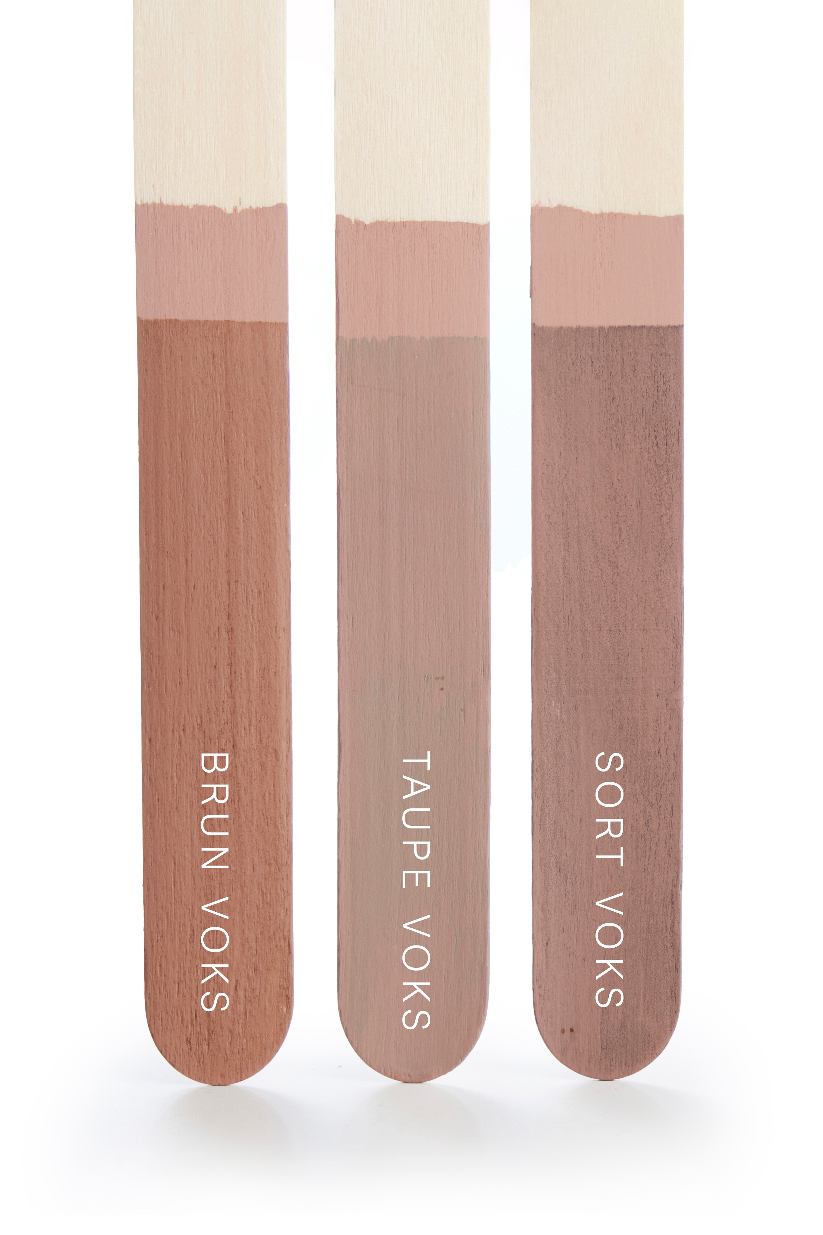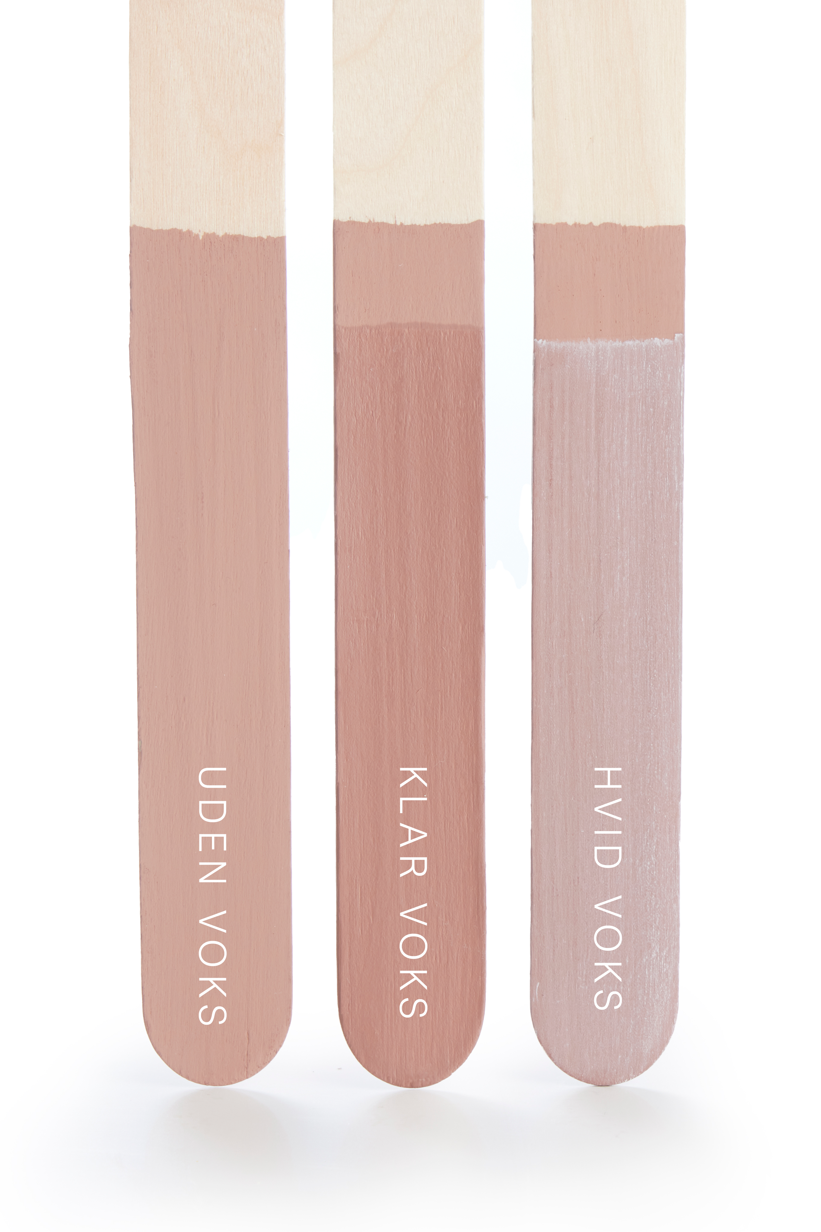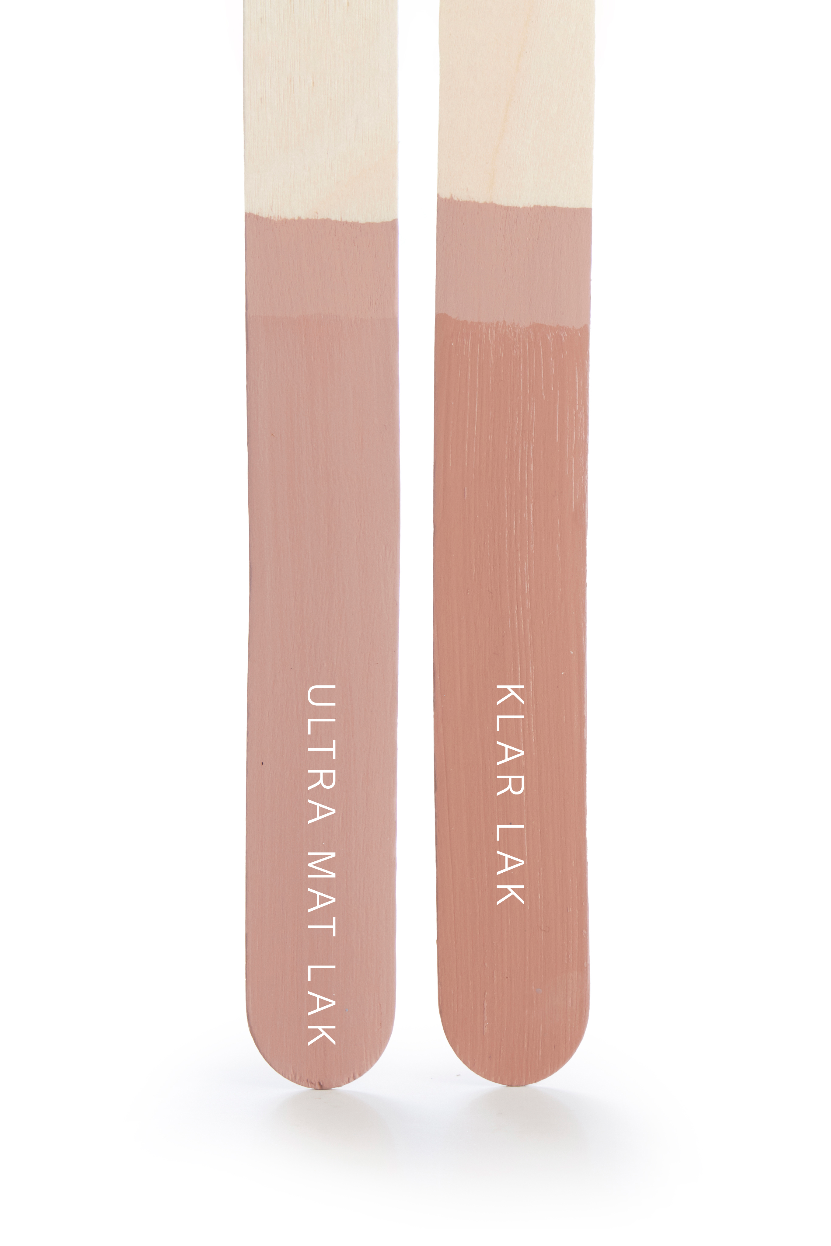 Vådt ler er farven, som har et flot rosa brunligt skær. Den er utrolig smuk på store og små møbler, da den har en varm glød. Den malede skammel har fået farven Vådt Ler og efterfølgende Ultra Mat Lak for at beskytte overfladen mod snavs. På de malede pinde kan du se hvordan farven forandre sig, ved brug af vores forskellige voks og lak typer. Vandbaseret miljøvenlig kalkmaling som også er velegnet til børnemøbler.