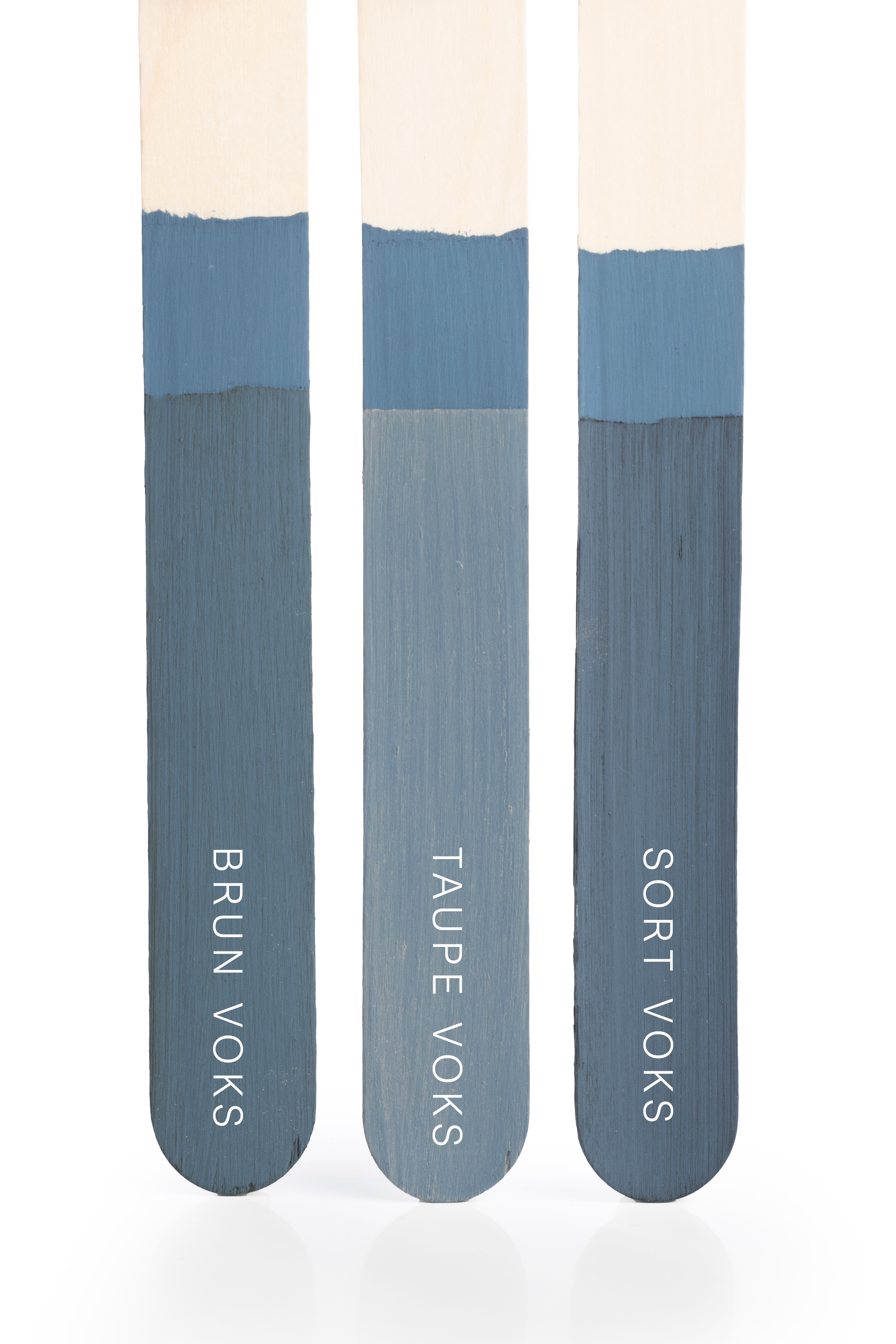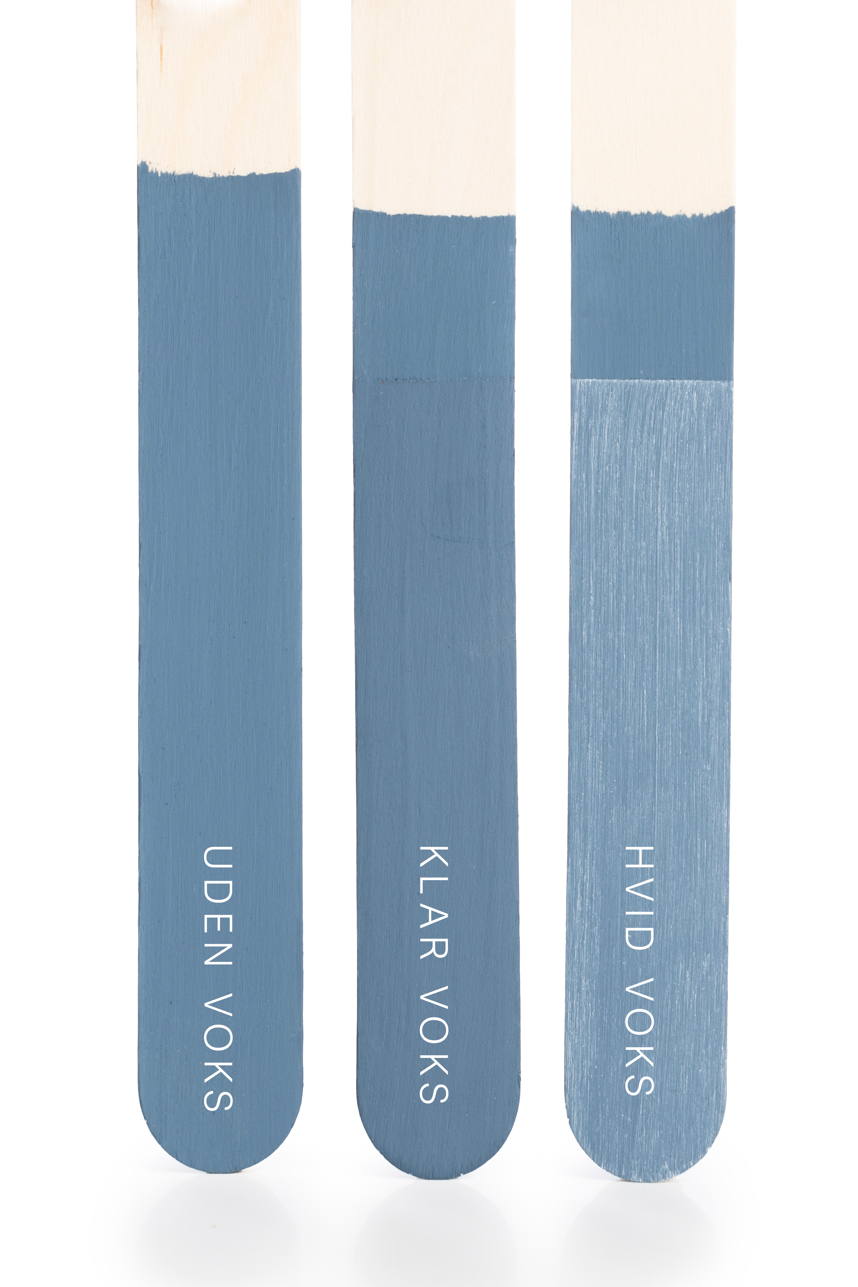 De malede pinde illustrerer samspillet mellem farven og vores voks- og lakbehandlinger, påført som første lag. For at bevare den oprindelige farve på kalkmalingen, anbefales det at påføre klar voks som første lag. Derefter kan der gives farvet voks som andet lag, alt efter hvilket udtryk man ønsker i forhold til patina.
