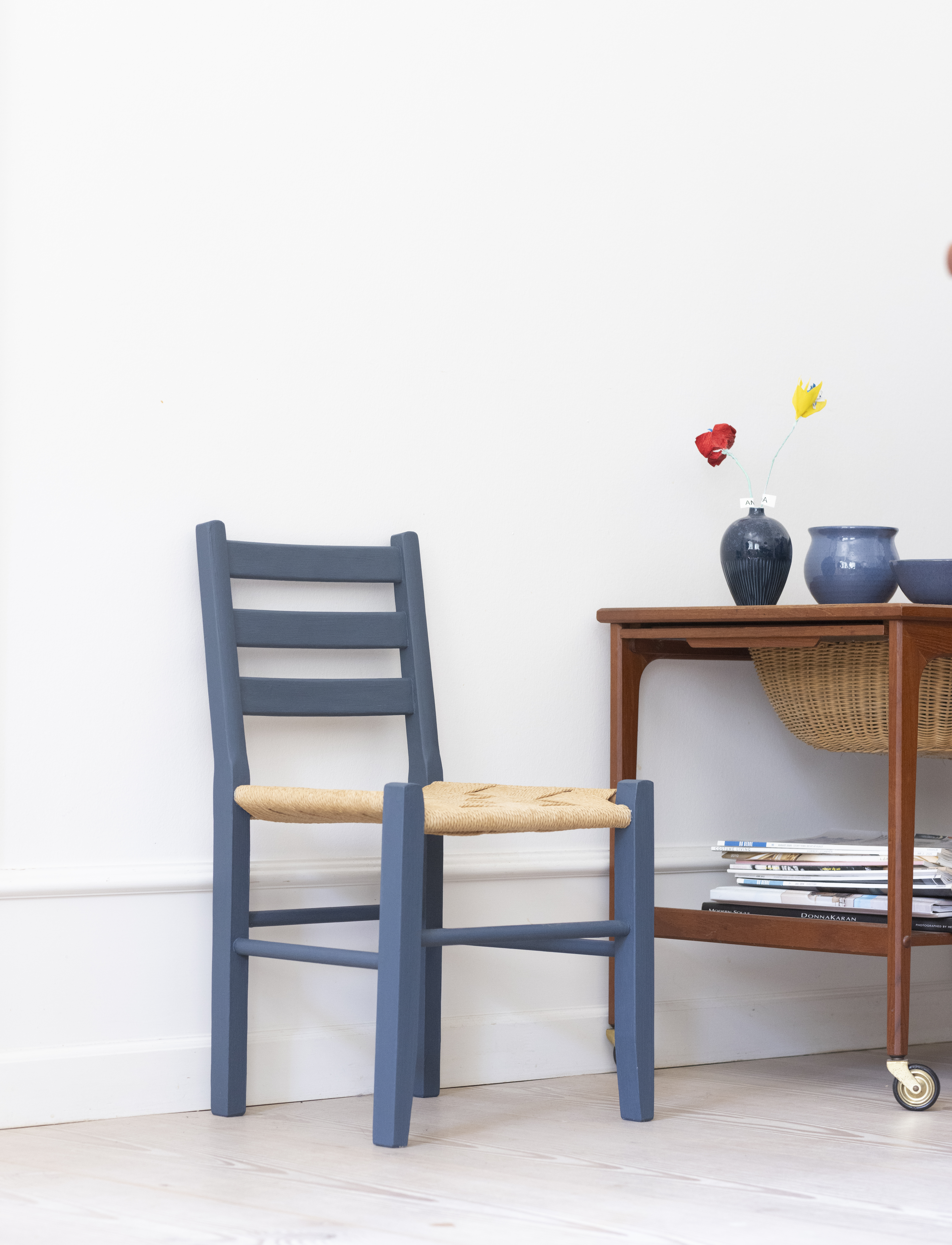 Den lille stol er malet med Vestenvind og efterfølgende har den fået 2 lag Ultra Mat Lak., som er påført i tynde lag.