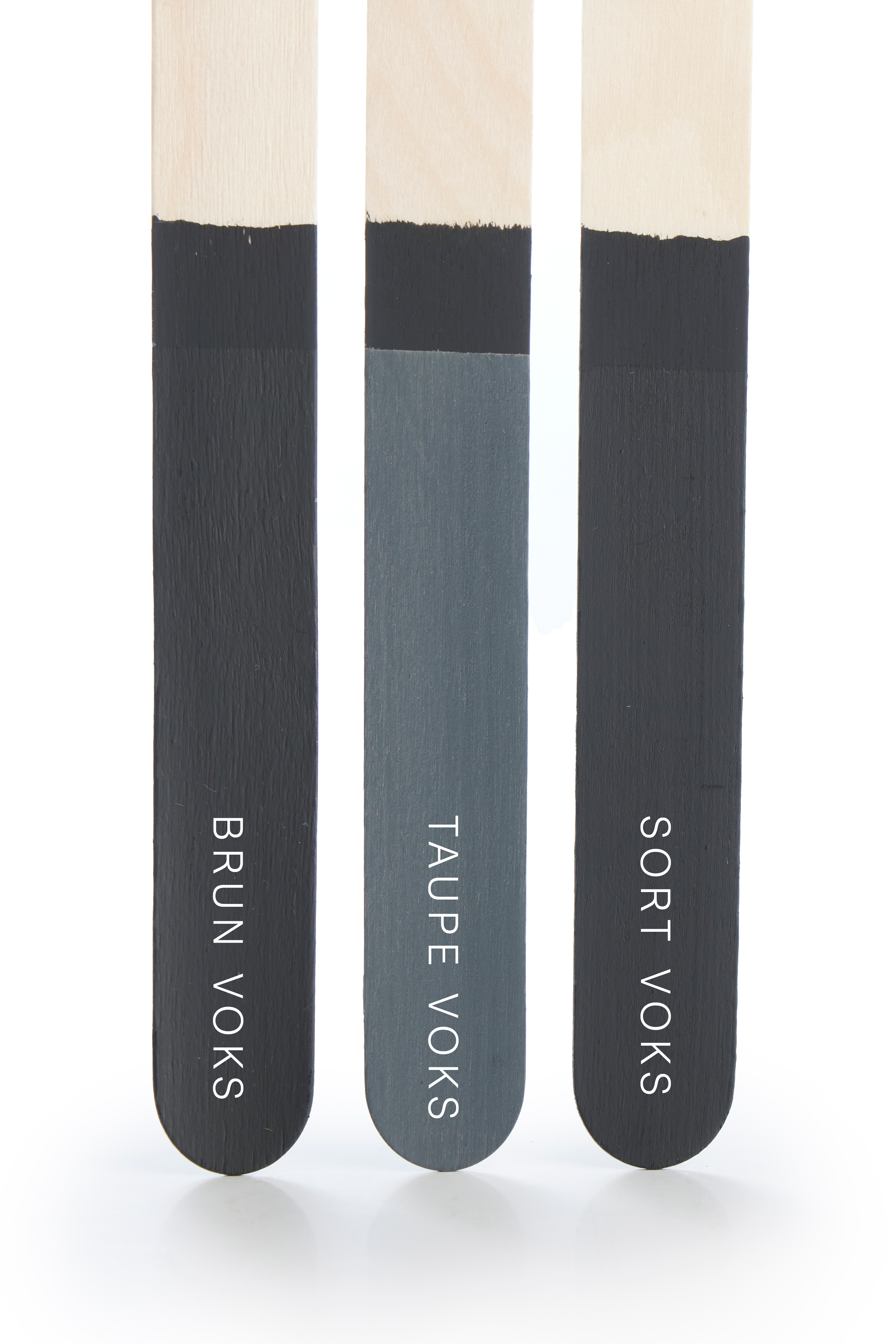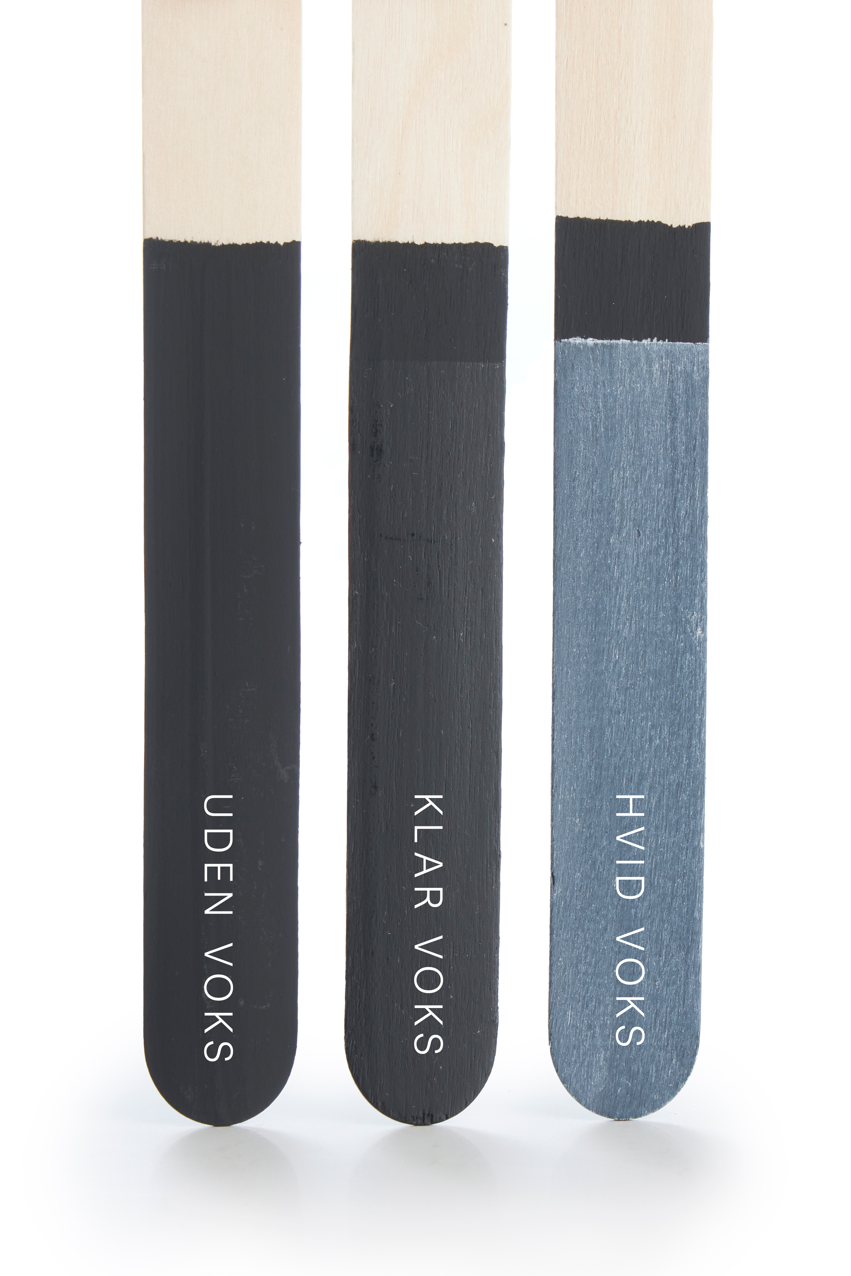 De malede pinde illustrerer samspillet mellem farven og vores voks- og lakbehandlinger, påført som første lag. For at bevare den oprindelige farve på kalkmalingen, anbefales det at påføre klar voks eller eventuelt sort voks når du maler med Sort Kul, som det første lag. Derefter kan der gives farvet voks som andet lag, alt efter hvilket udtryk man ønsker i forhold til patina.