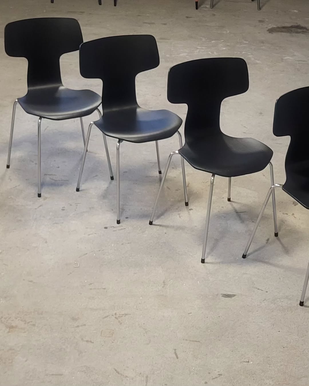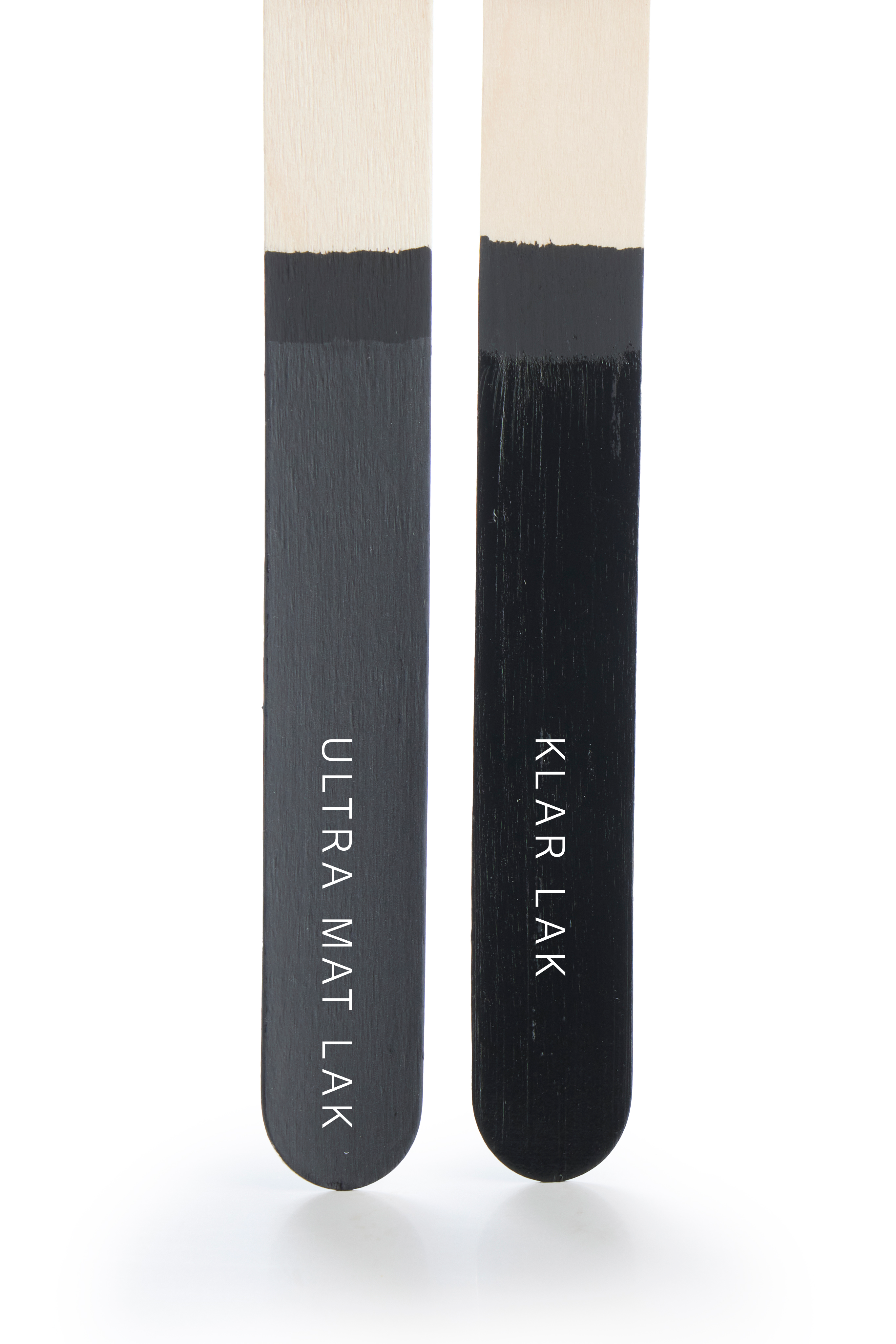 Klar Voks.T-stolene er ligeledes malet med Sort Kul og efterbehandlet med Ultra Mat Lak. Det er vigtigt at påføre lakken i tynde lag, da den fremstår hvid under påføring, men tørre op og bliver helt klar. Hvis lakken bliver påført for tykt, kan overfladen få et lysere skær og dermed miste den dybe sort tone.