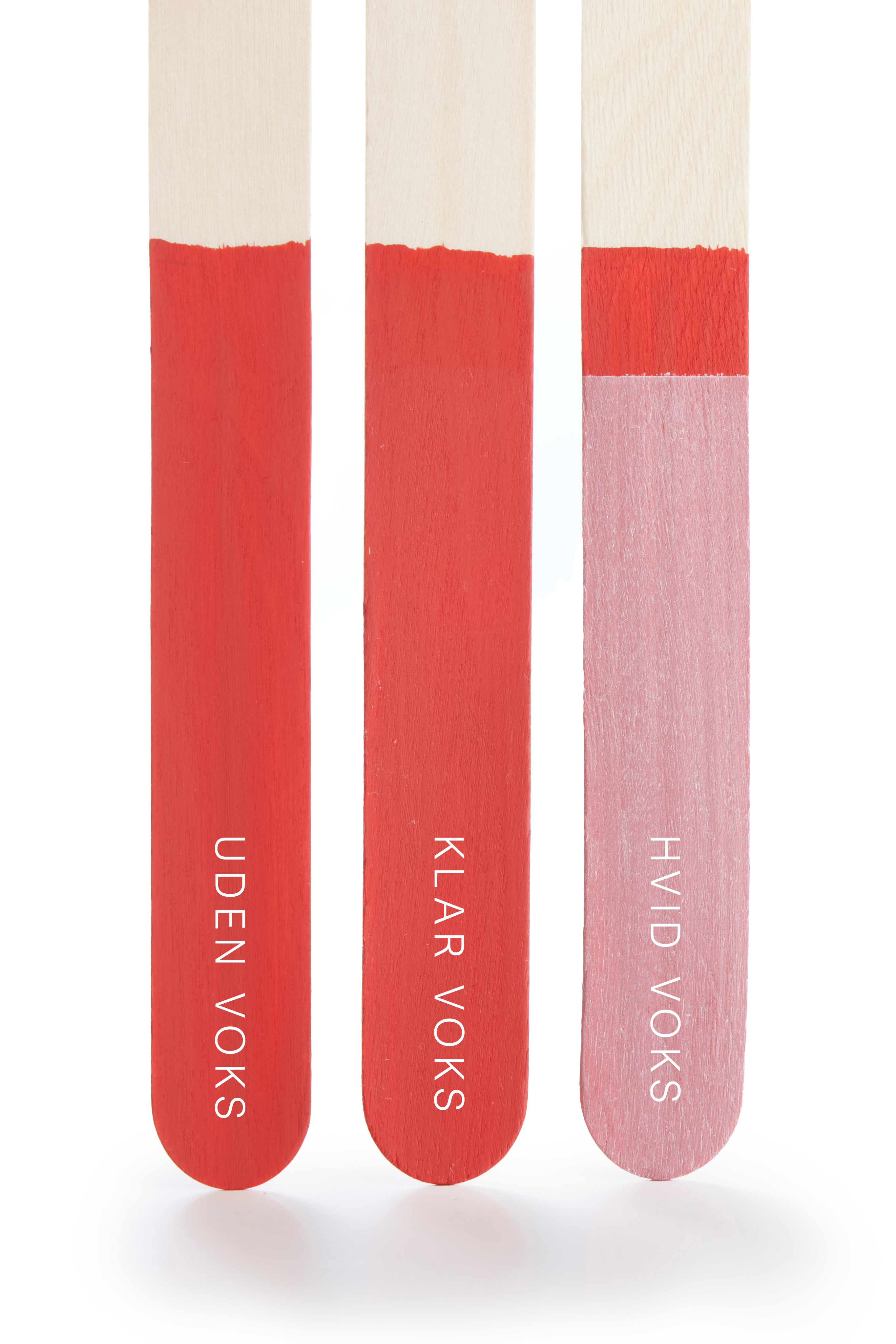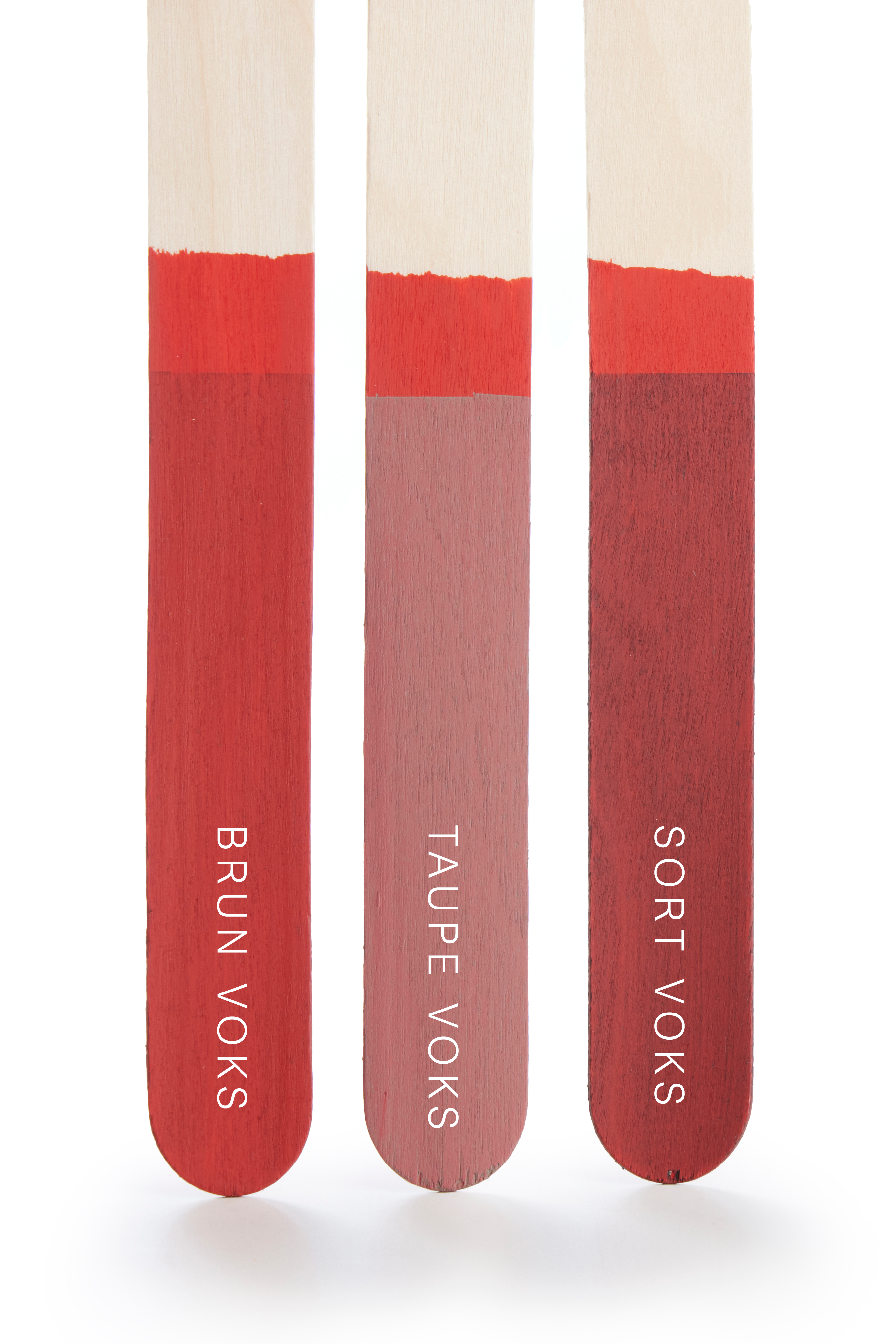 De malede pinde illustrerer samspillet mellem farven og vores voks- og lakbehandlinger. For at bevare den oprindelige farve på kalkmalingen, anbefales det at påføre klar voks som første lag. Derefter kan der gives farvet voks, alt efter hvilket udtryk man ønsker i forhold til at give sit projekt patina, så det ser gammelt ud.