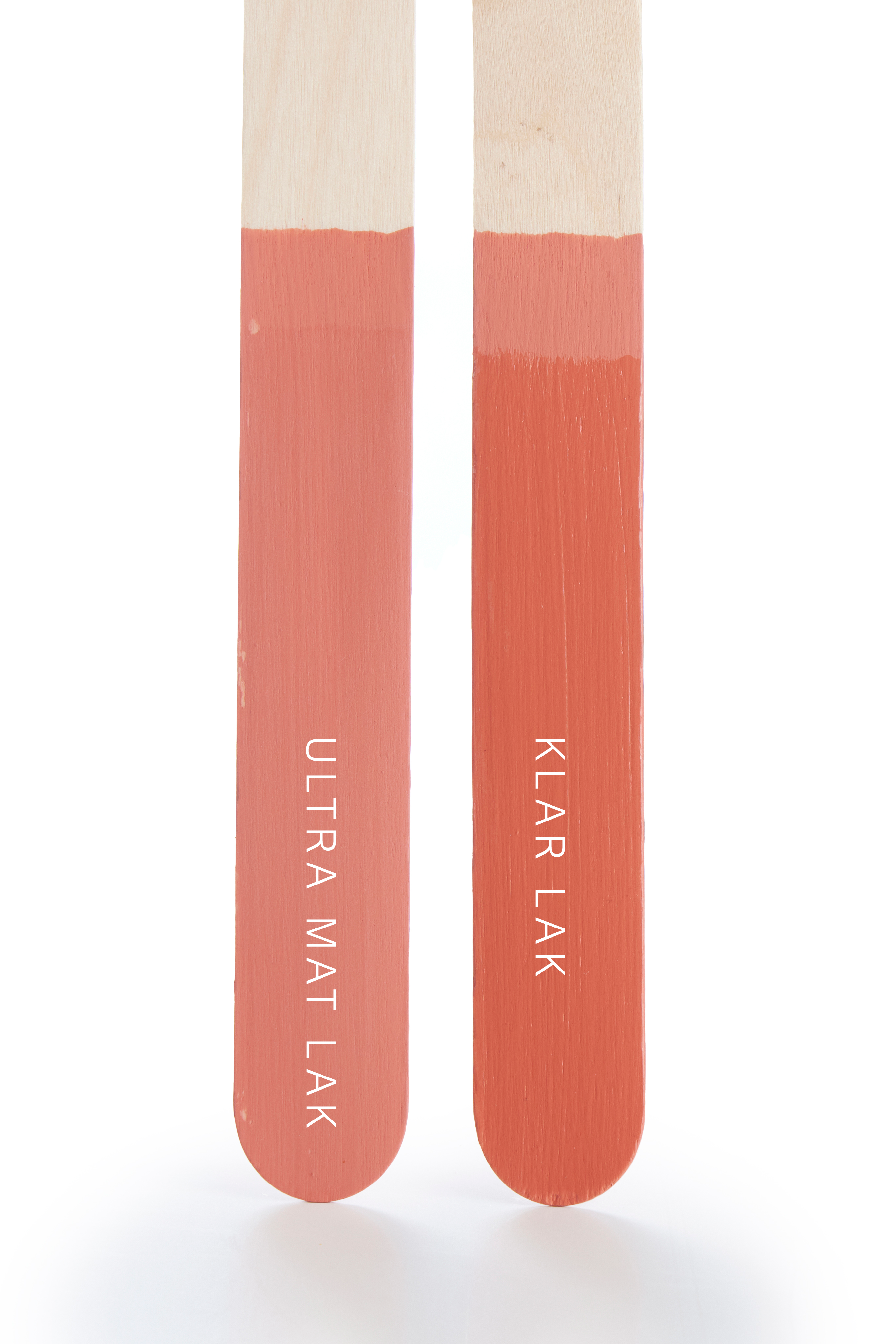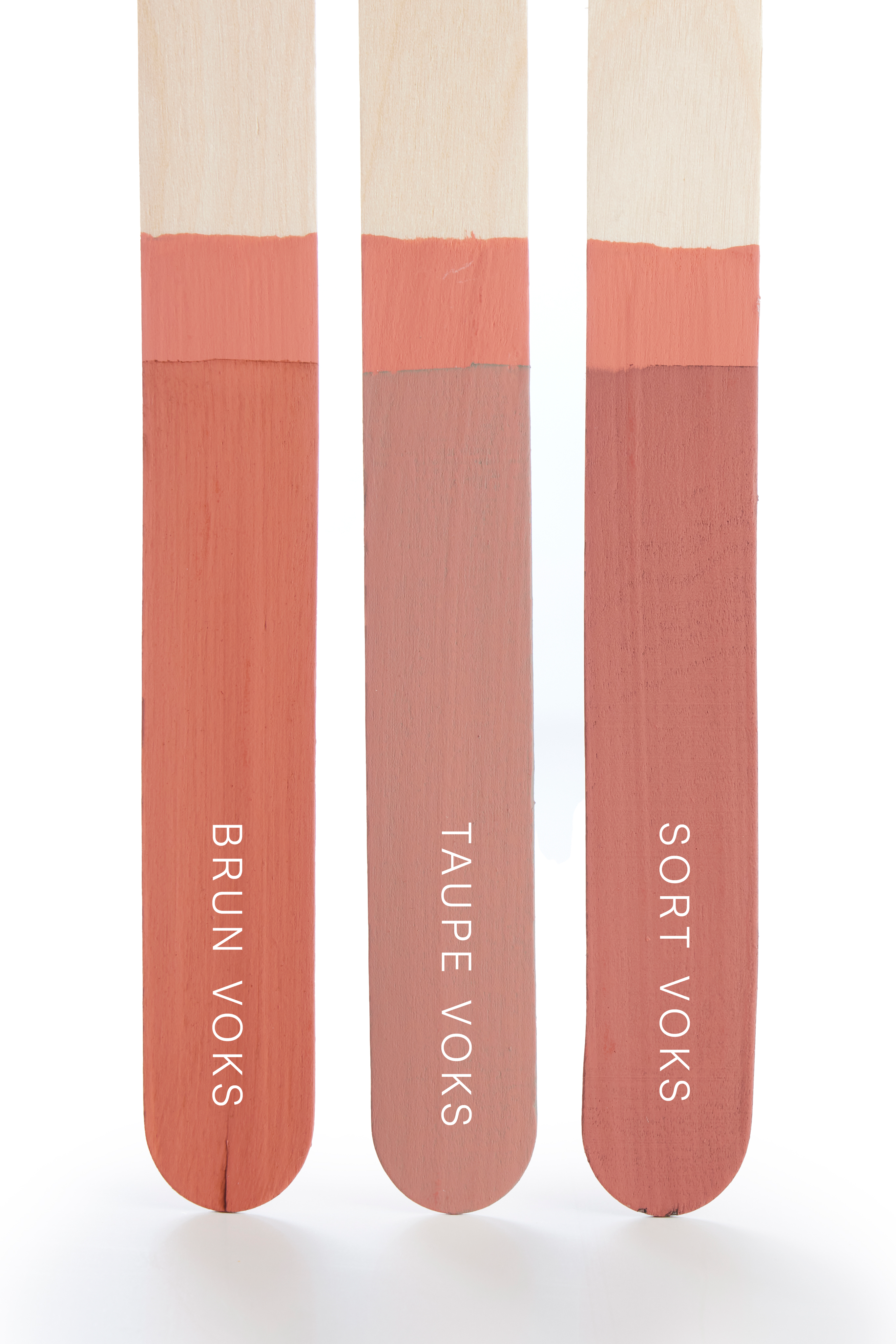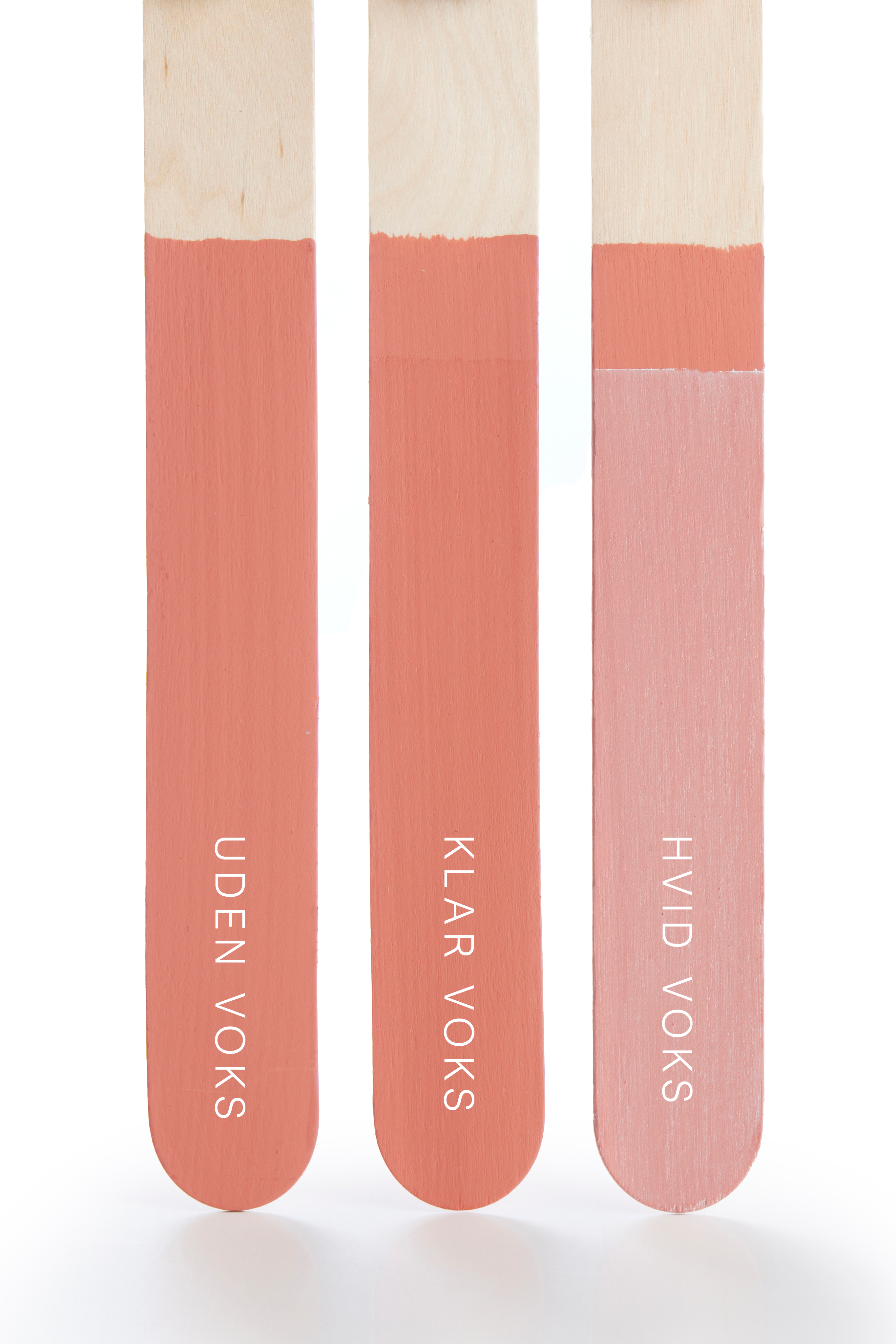 De malede pinde illustrerer samspillet mellem farven og vores voks- og lakbehandlinger, påført som første lag. For at bevare den oprindelige farve på kalkmalingen, anbefales det at påføre klar voks som første lag. Derefter kan der gives farvet voks som andet lag, alt efter hvilket udtryk man ønsker i forhold til patina.