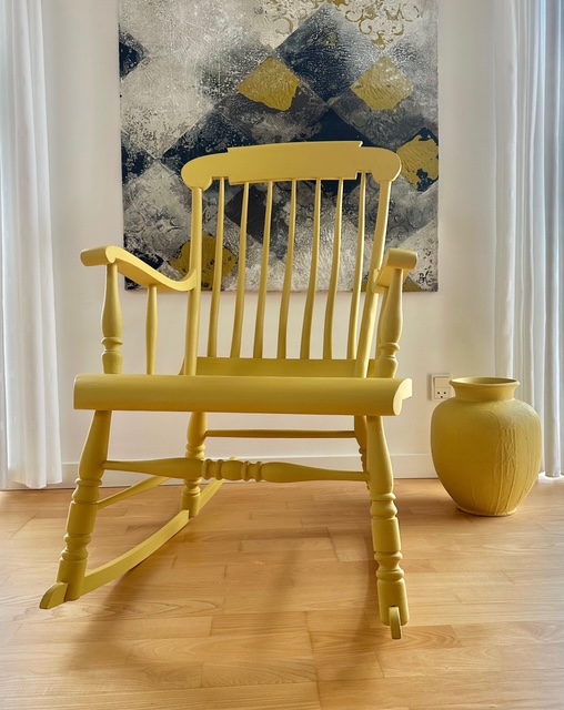 Rejnfan har fået sit navn, fordi den har stor lighed med planten Rejnfan. Den har en vis lighed med karry. En frisk farve, som kan skabe kontrast til det øvrige interiør. Brug eksempelvis Rejnfan på 4 til 5 at dine småmøbler og interiør, dette for at skabe en helhed i din indretning, hvor farven går igen flere steder. En nem og billig løsning, hvor du kan genbruge dine møbler og interiør, blot ved at male med vores kalkmaling. Møblerne som billederne viser er malet med en lys farve som 1. lag, dette kunne evt. være en spærregrunder, sne eller skumsprøjt, dette da den gule Rejnfan er lidt transparent i farven. og dermed vil dække bedre. Derefter 2 lag Rejnfan og forsegling med klar voks. Den gule vase er malet på samme måde, dog i fede lag, så malingen løber lidt ned af vasen, dette for at give lidt struktur. Det flotte maleri bag gyngestolen, er ligeledes malet med kalkmaling. Der er utallige muligheder med kalkmaling og slut resultatet bliver så flot og giver glæde hver dag.