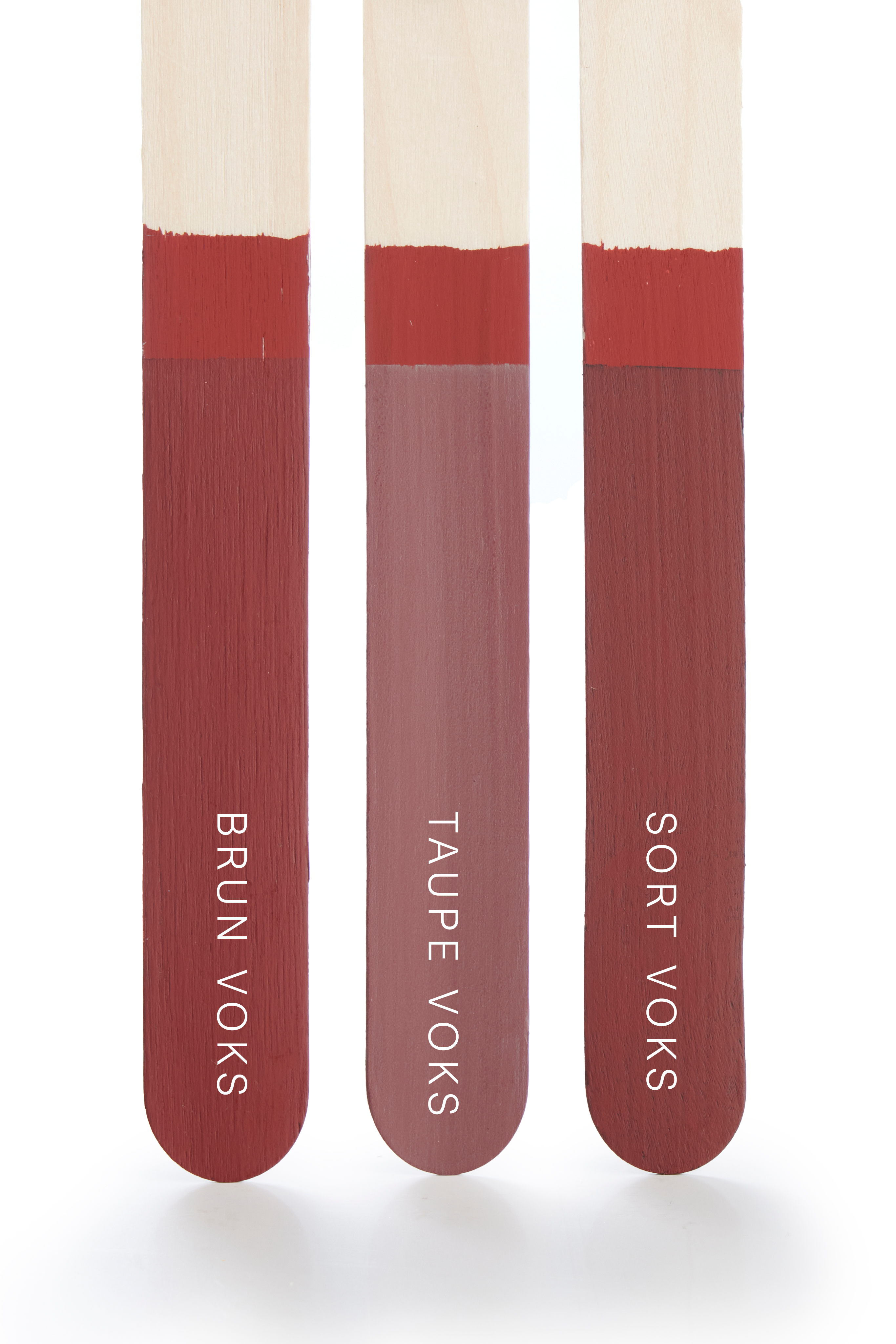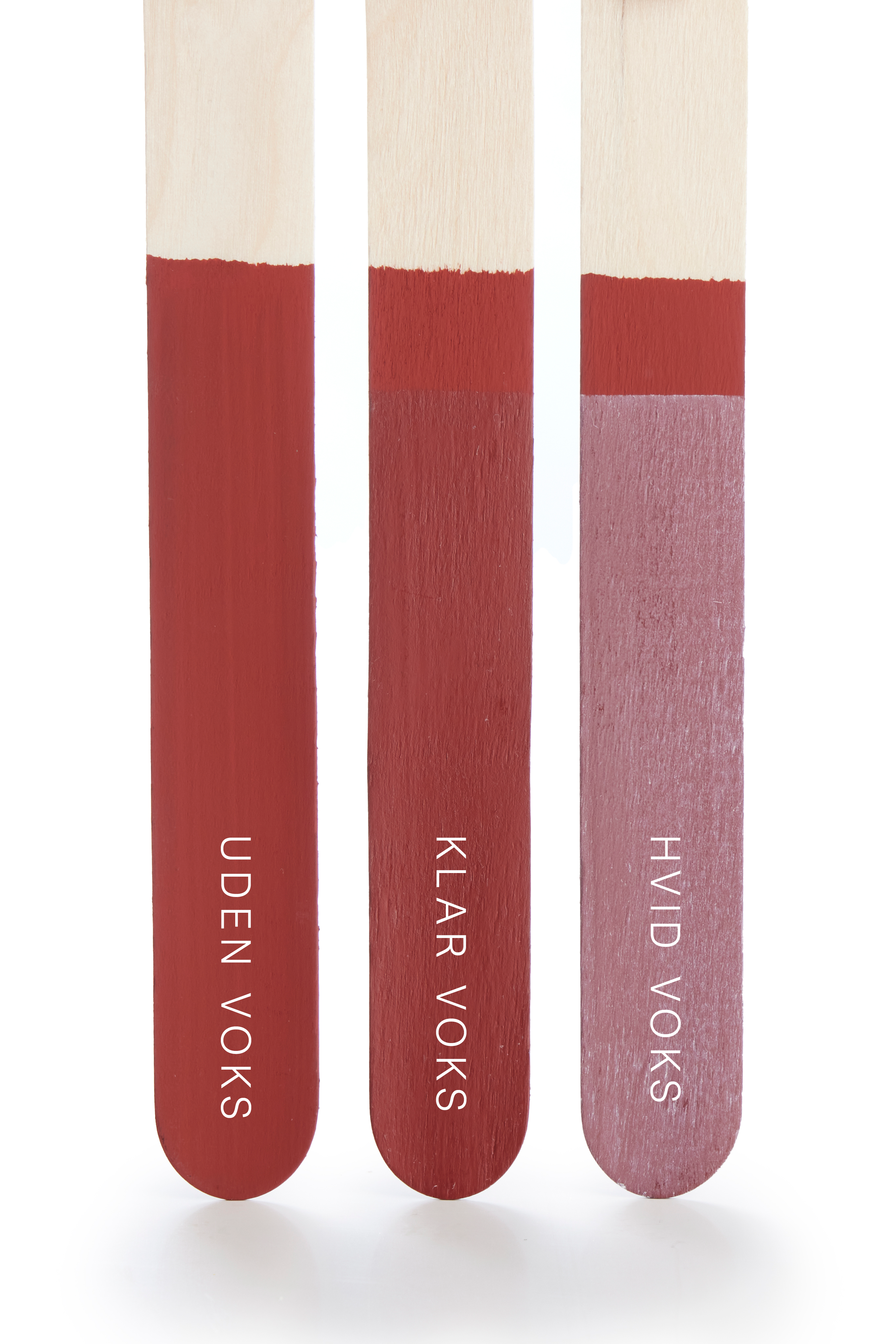 De malede pinde illustrerer samspillet mellem farven og vores voks- og lakbehandlinger, påført som første lag. For at bevare den oprindelige farve på kalkmalingen, anbefales det at påføre klar voks som første lag. Derefter kan der gives farvet voks som andet lag, alt efter hvilket udtryk man ønsker i forhold til patina.