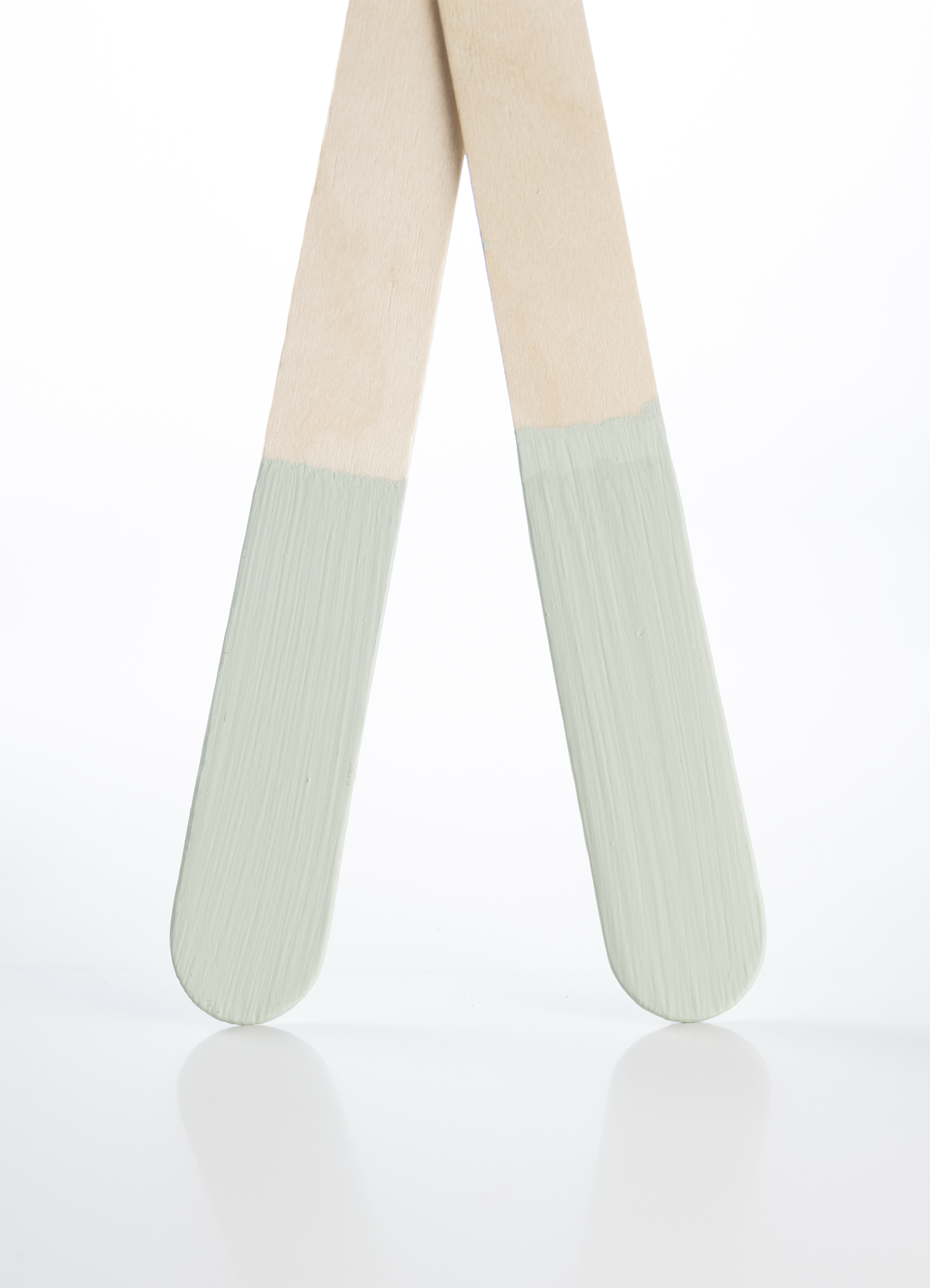 De lyseblå og grønne pinde viser kalkmaling uden lak og med Ultra Mat lak.