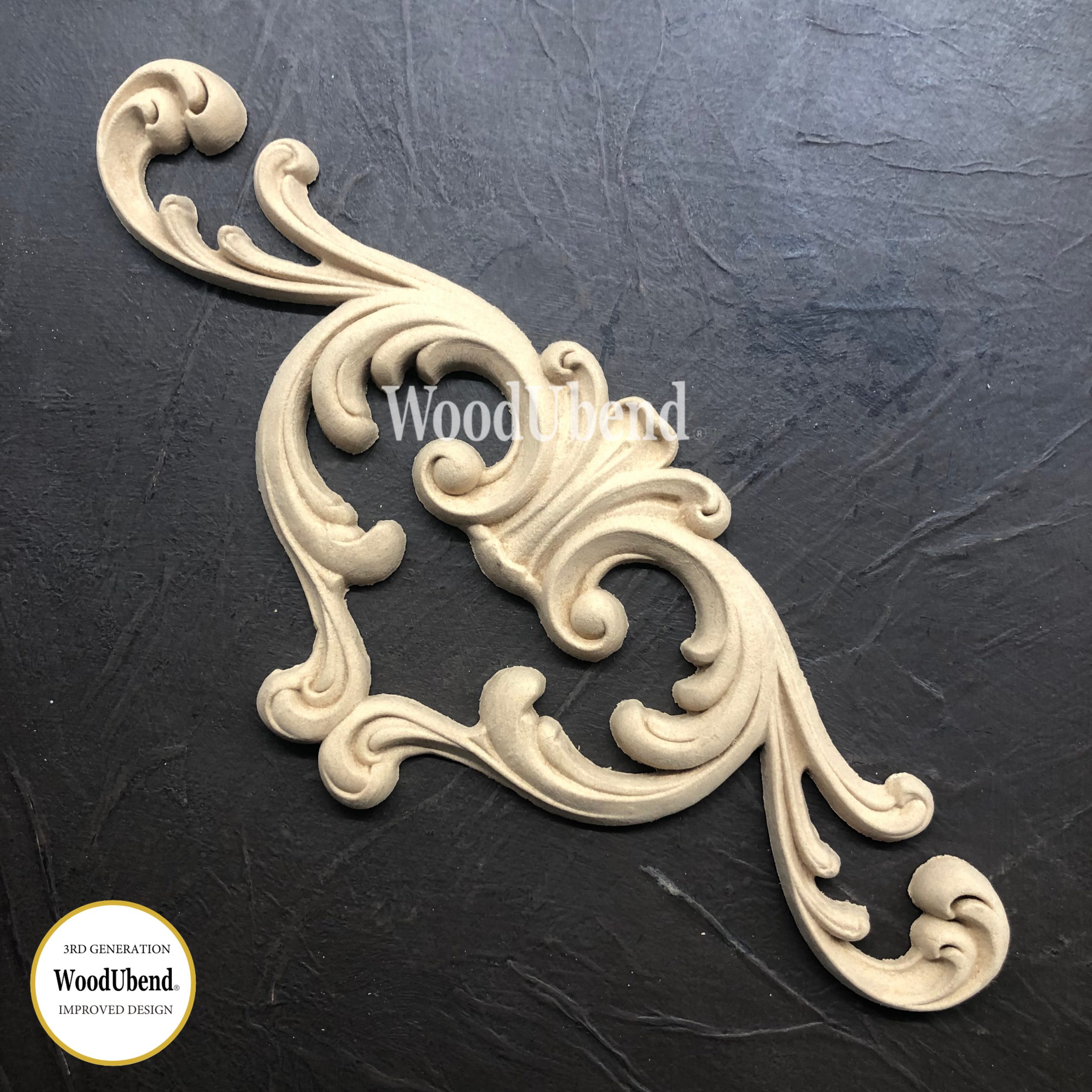 Flot stor træudskæring som er velegnet som et midterstykke på en skuffe, en sengegavl, eller måske øverst på dit møbel som du vil istandsætte. Træudskæringerne fra WoodUbend har alle træets egenskaber, den kan slibes, blive malet, saves i, bores og sømmes i. Dette gøres når den er kold. Når du varmer træudskæringen kan den bøjes, formes og bliver fleksible så den kan påføres enhver overflade. Du kan bruge en varmepistol, hårtørre eller bageplade til at påfører varme på din træudskæring, det er enkelt og sjove. Opvarmingen betyder at formen vil danne en ultra stærk binding til din overflade. Ligeledes kan du også fjerne træudskæringen fra din overflade efter nogle timer eller få dage, hvis du fortryder dit design. Så er det bare at prøve igen med opvarming og placering. Det kan ikke blive nemmere, og du kan designe en hvilken som helst genstand i dit hjem. Sælges enkeltvis. Hvis du har brug for flere end vi har på lager så kontakt os endelig.