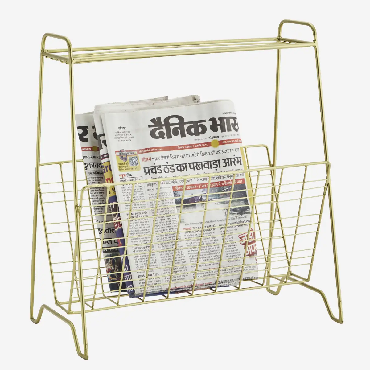 En flot og anvendeligt magasin holder med en lille hylde fra Madam Stoltz. Denne flotte magasin holder er lavet i jern og med farven antik brass. Magasin holderen er perfekt til opbevaring af dine aviser og magasiner, og kan bruges overalt i dit hjem eller sommerhus. Brug magasin holderen fra Madam Stoltz i stuen ved siden af din yndlings plads i sofaen, så har du plads til dine blade og en god bog, og har dem lige ved hånden. Eller brug den i køkkenet ved siden af dit spisebord, så har du det godt sted at opbevarer dine magasiner. Magasin holderen er utrolig praktisk med den lille hylde, som du evt. kan pynte med en lille blomst. Praktisk og anvendelig og ikke mindst flot i sit design.