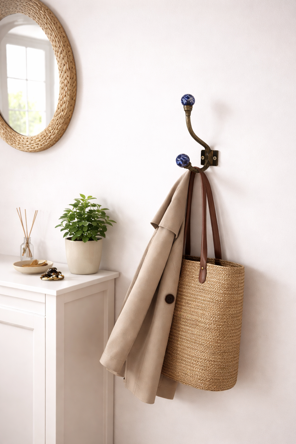 Tilfør hjemmet et elegant og funktionelt udtryk med denne nostalgiske knage fra Lundager. Knagen er udført i mørk antique brass med smukke blå porcelænsknopper og dem er ideel som knage til væg, frakkekrog eller vægknage til ophæng af jakker, tasker og tørklæder. Perfekt til entré, soveværelse, badeværelse eller køkken – alene eller som del af en stilfuld og praktisk knagerække.