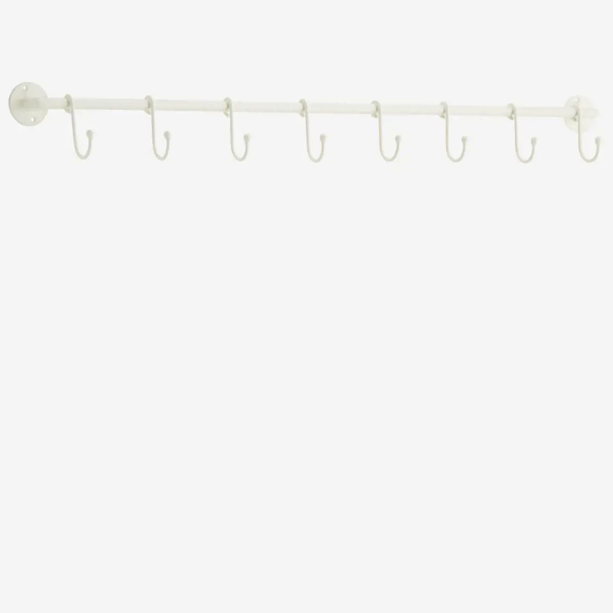 Flot metal knagerække fra Madam Stoltz i farven cream med 8 kroge. Brug knagerækken i dit køkken og hæng den over køkkenbordet. Så kan du nemt hænge dine køkkenredskaber, grydelapper eller yndlings krus på den, og det er nemt at få fat på. Eller hæng den på væggen i køkkenet til forklæde og viskestykker. Knagen kan også bruges i entreen til dine jakker og tørklæder, eller på badeværelset til håndklæder og tøj.