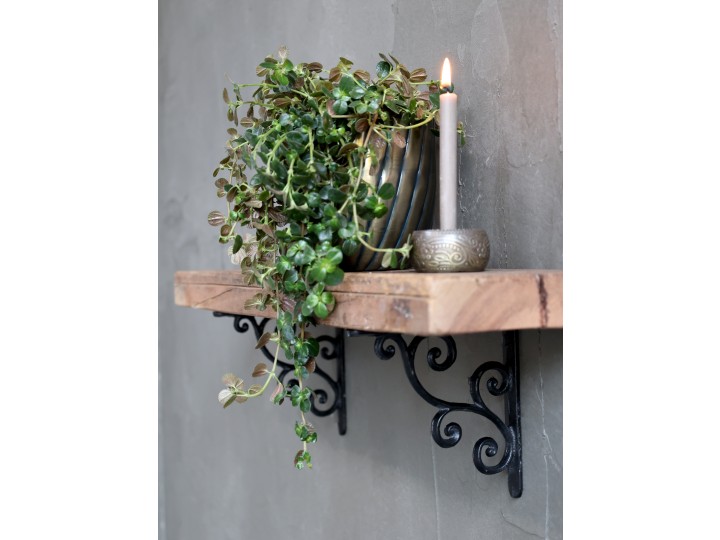 Chic Antique har så mange smukke hyldeknægte, og kommer nu med en helt ny model, som ikke er til at stå for. Hyldeknægten med de flotte snirkler har farven antique sort med et strejf af patina, og er så smuk og dekorativ når de er monteret på væggen. Den er meget fin at bruge til en hylde af genbrugstræ eller et stykke træ i eg eller hvad du syntes passer ind i dit hjem. Har du et køkken uden overskabe er disse hyldeknægte så smukke at have hængende over køkkenbordet. Du kan helt selv vælge om du vil have en kort hylde med 2 hyldeknægte under eller måske en lang hylde som fylder hele væggen. Det er muligt at placerer hyldeknægtene med ca. 70 - 100 cm. mellem hver når du monterer en lang hylde, alt efter hvor meget hylden skal bære. Du kan også lave en smuk væg i stuen eller på pigeværelset ved at hænge en eller to hylder under hinanden eller forskudt fra hinanden. Hyldeknægtene gør hylderne så meget smukkere end du kan forestille dig.